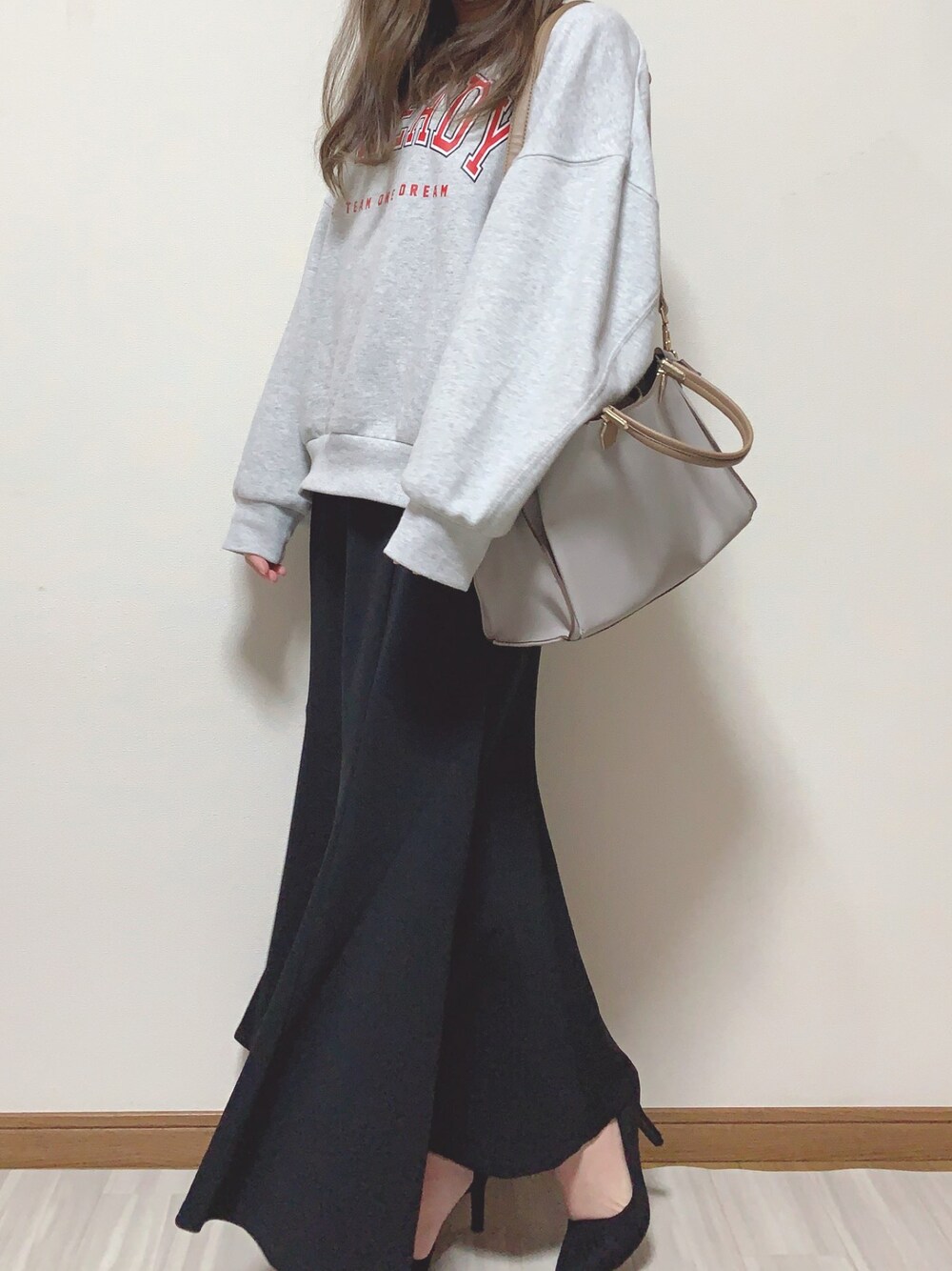 おはようございます 見にきていただきありがとうございます☺︎ マーメイドスカートにスウェットでキレイめカジュアルコーデ組んでみた˚✧₊⁎