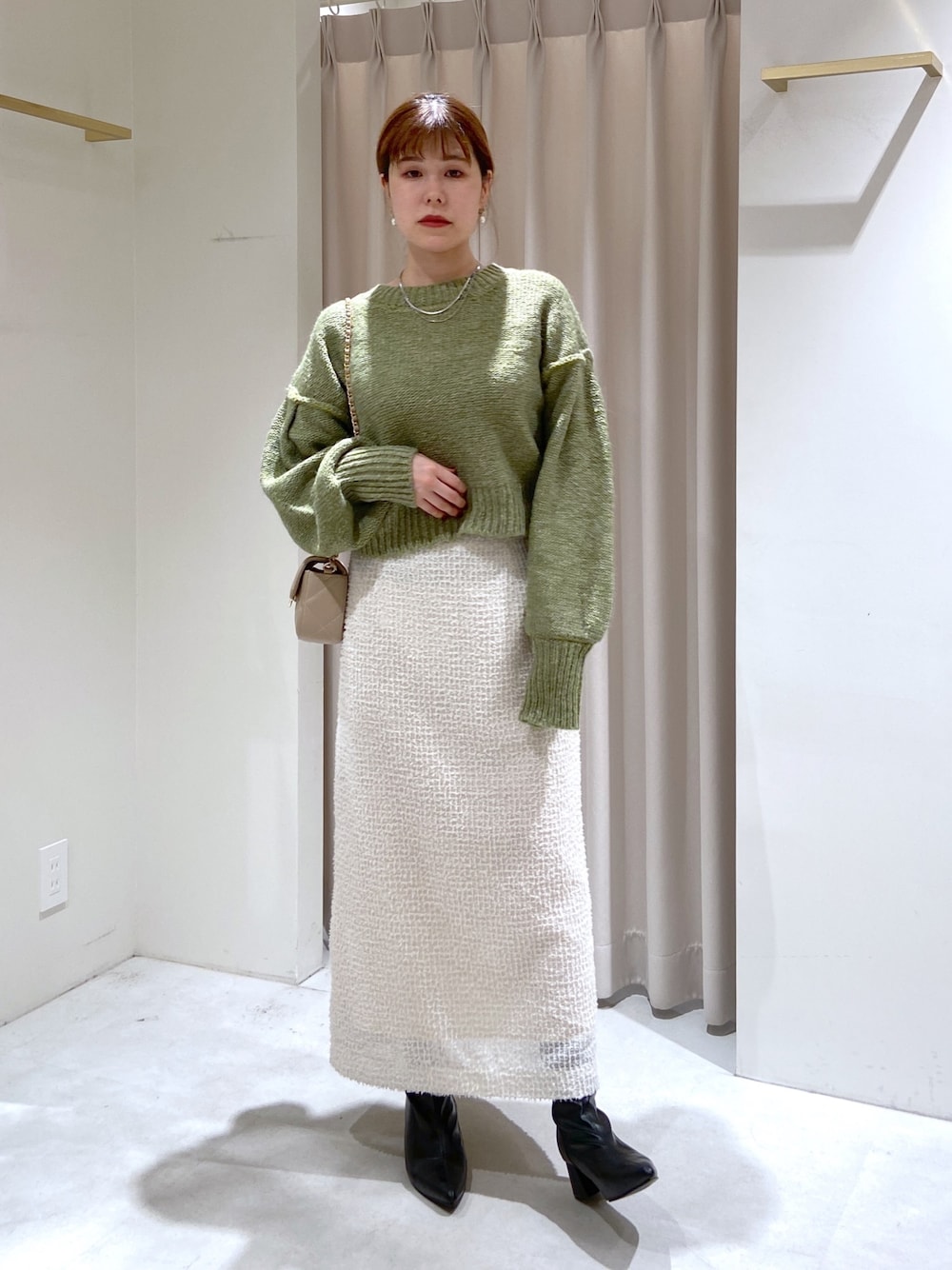 ************************* 骨格:ストレート パーソナルカラー:ブルベ夏/普段サイズ:S ************************* ・バックリボンショート丈ニット (グリーン/フリーサイズ) ボリュームスリーブは、ドロップした切り替えからなので肩周りは比較的すっきり!骨格ストレートにも◯ ・フェザーシフォンナロースカート (オフ/Sサイズ) 骨盤や太もも周りが気になる私でも、腰回りから程良く幅がありカバー力◯ポリエステルでとにかく軽い! ・ストレッチショートブーツ(ブラック/Mサイズ) 23.5cm、幅広め、甲高さ普通。 生地が柔らかい! ヒールが高すぎないので長時間楽に歩けそう♡足先細いけど窮屈感は少ない。厚めの靴下重ねる場合はL。