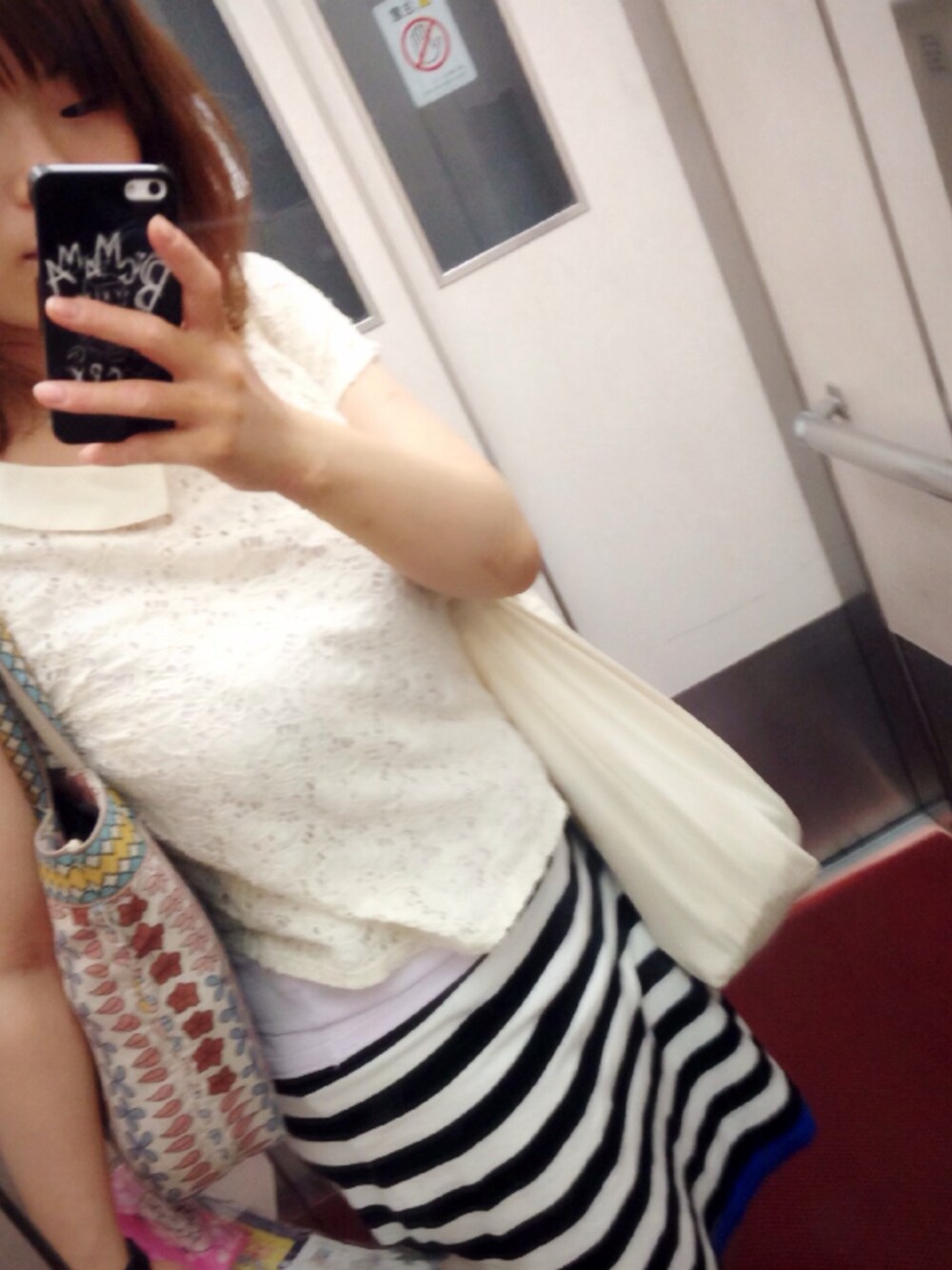レース調ブラウス/マジェスティックレゴン リバーシブルボーダースカート/Raycassin 時計/CASSIO たまにはおねーさんコーデ。 まあ仕事終わりでほぼすっぴん、髪ボサボサなんですけど。←