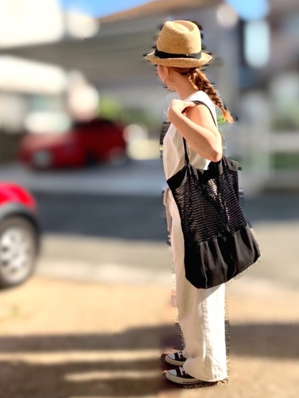 ホワイトコーデに小物はブラックで。 モノトーンコーデ🐼 三つ編みピーン!なってますね🐒😂