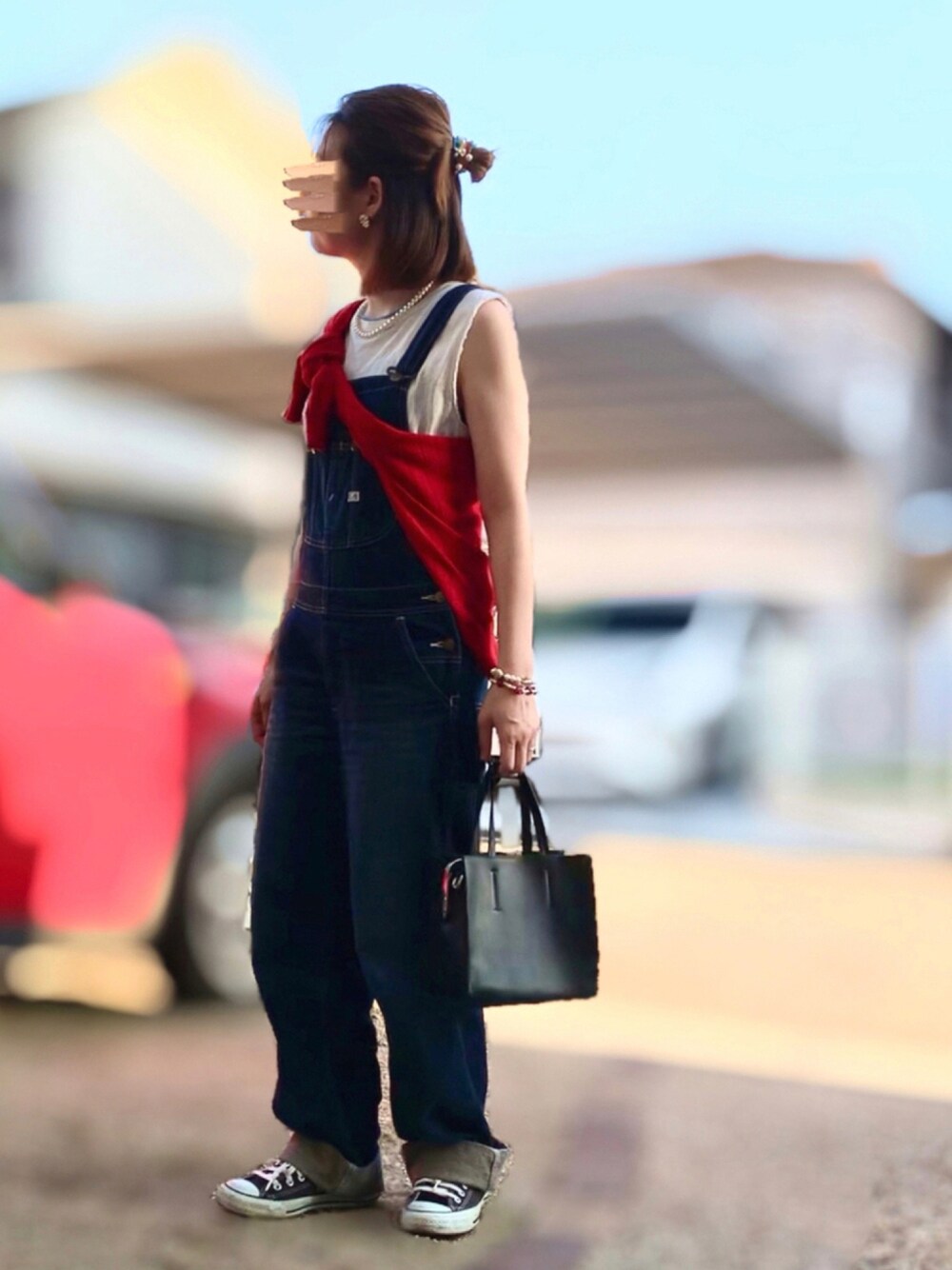 シンプルサロペコーデに赤たすき🍉 パールアクセでちょい大人👵🏻