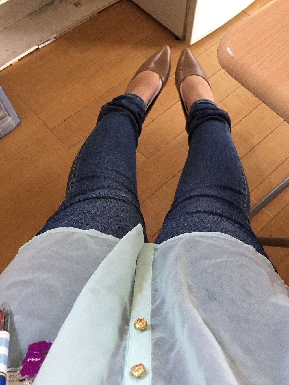 お昼ご飯のドレッシングシャツに噴射💦 いろんなとこにシミあるのは大目に見てね(⃔ *`꒳´ * )⃕↝ そして 久々のロールアップなしのパンツ👖 何度もロールアップしたい欲にかられたけど、 ピチピチスキニーだったので断念…。 でもスキニーからのパンプスな感じ好きー❤️