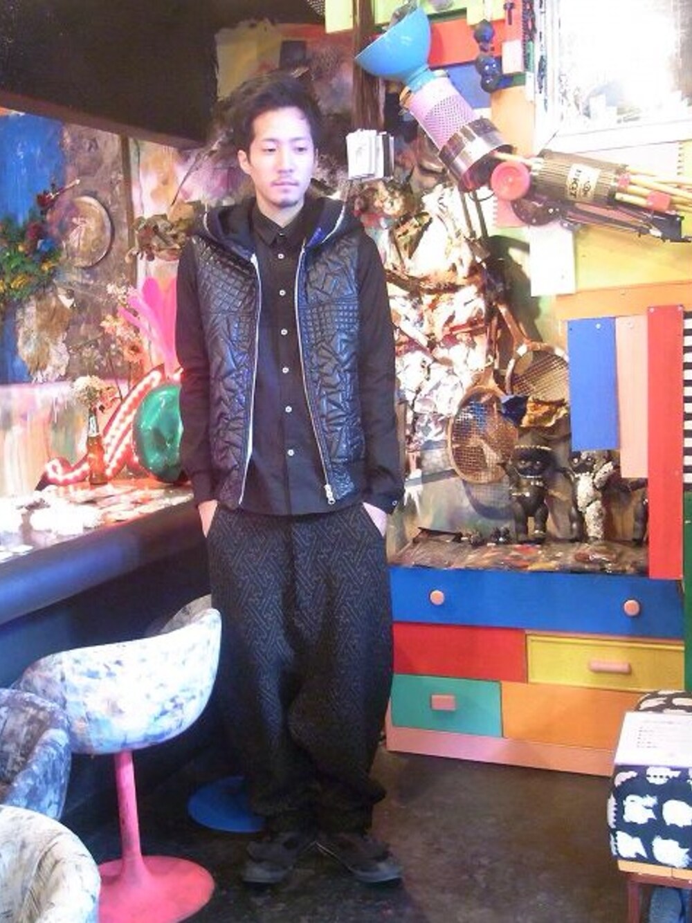 全体的にブラックでまとめました。 アンリアレイジのパッチワーク マカロニックの数字キルティング 細かく手の込んだアイテムです。 ストフのパンツは着用したときに独特なシルエットが◎
