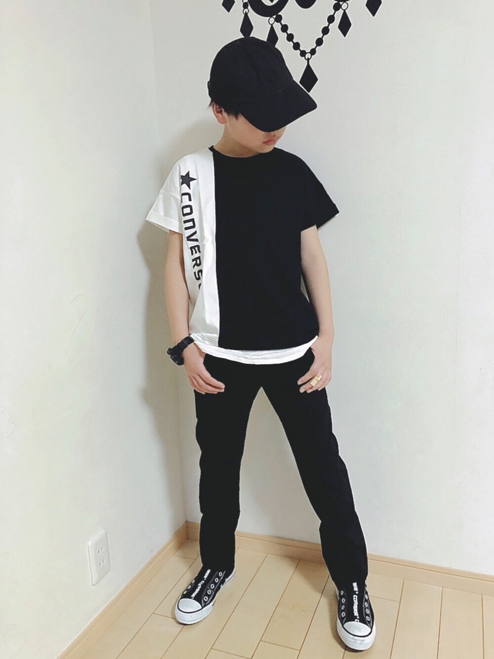 息子、モノトーンコーデ。 converse ALL STAR LOGO TAPE COLLECTION✨ カッコいいです ( ˃̶᷇ ‧̫ ˂̶᷆ ) 22.5㌢からありました😊