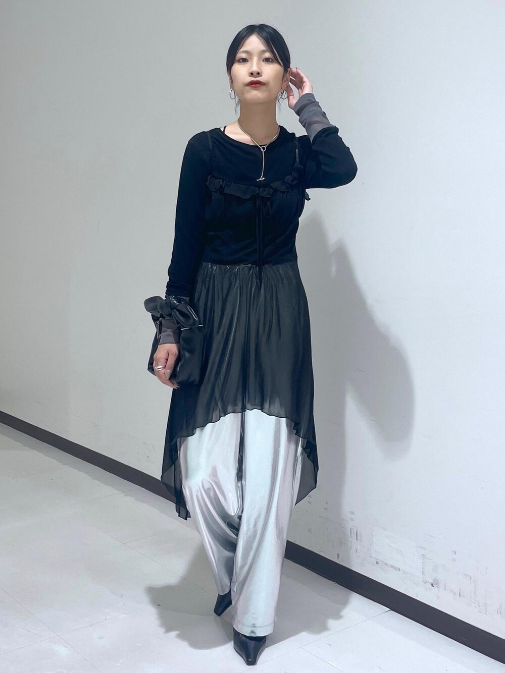 こんにちは! アダムエロペ ルミネ大宮店の松村です。 一見合わせ難しそうなチュール系のキャミ。 ブラックワントーンでハーフパンツなどと合わせても可愛いのですが、モードに寄りすぎてしまうので今回はワイドパンツをレイヤードしてみました◎ ゴムなのと、見た目より全然生地軽く薄めで伸縮性もありますのでリラックスして着ていただけますよ! 是非参考までに(*^^*) ACCESSORIES:私物