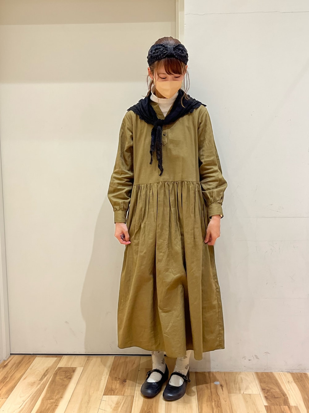 出勤コーデです★ 綺麗なオリーブ色のワンピース🫒 白黒の小物で合わせました🎹 インナーに着てるタートルカットソーも 着心地良くておススメです!!
