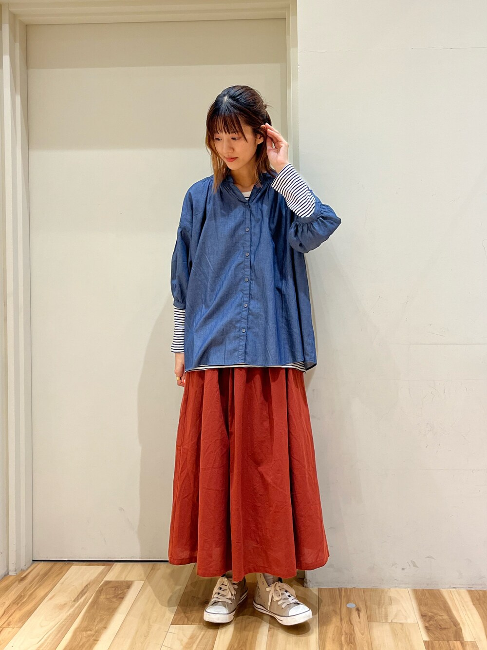 カジュアルなレイアードコーデ🦕 色々使えそうなボーダーロンTを インナーに着ました♪ チラッとボーダーが見えるだけでポイントに💡 ブラウスはデニム見えですが、 とても柔らかい生地感です🧢