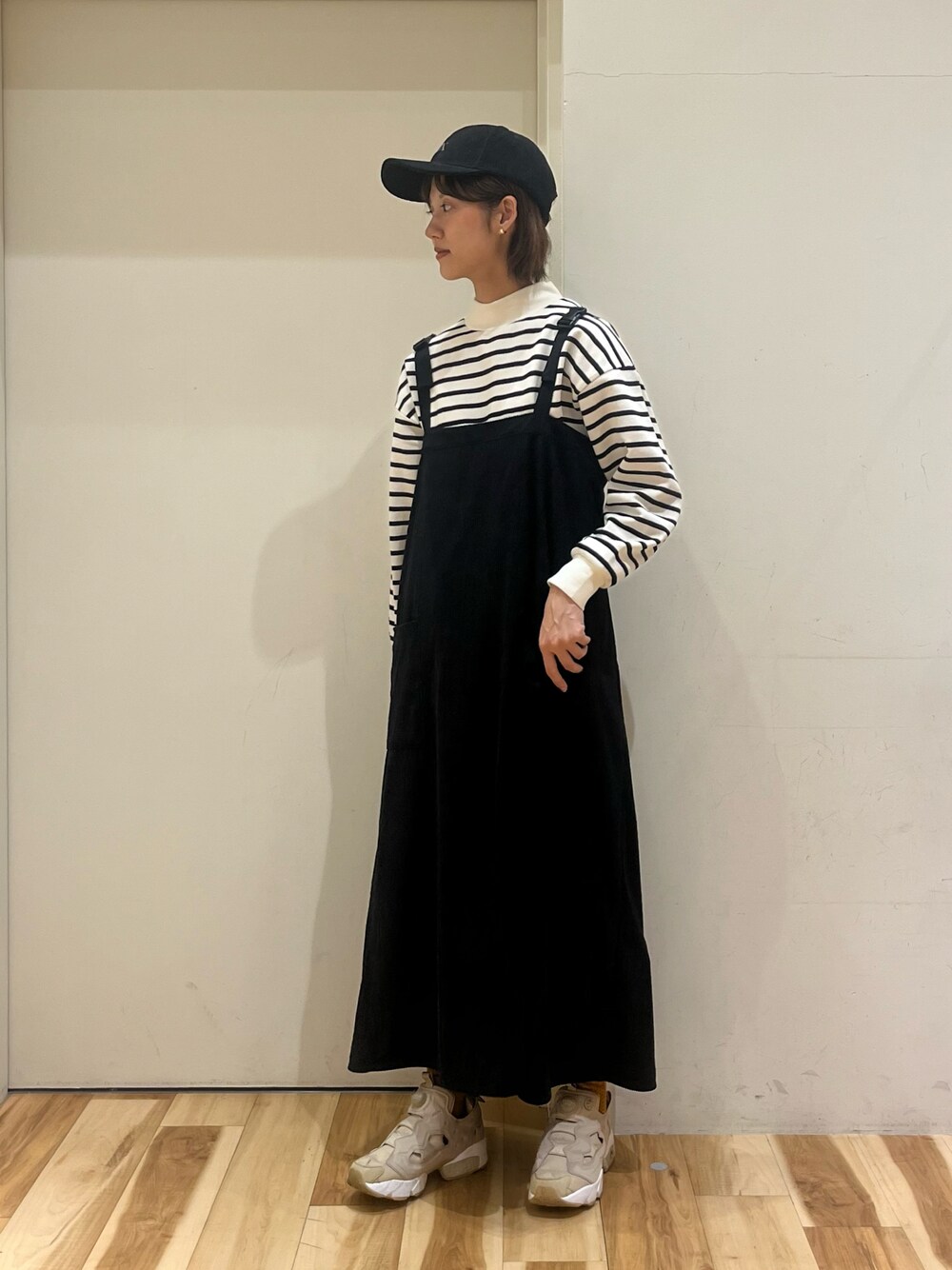 コーデュロイのジャンスカは 肩紐の長さが調節可能🔗 定番ボーダープルオーバーと合わせて カジュアルコーデ👟