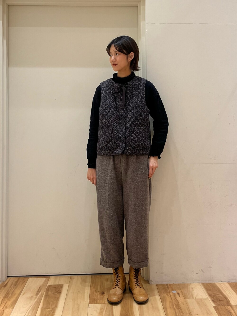 出勤コーデ🥾 花柄ベストを主役にダークトーンでまとめました🌼