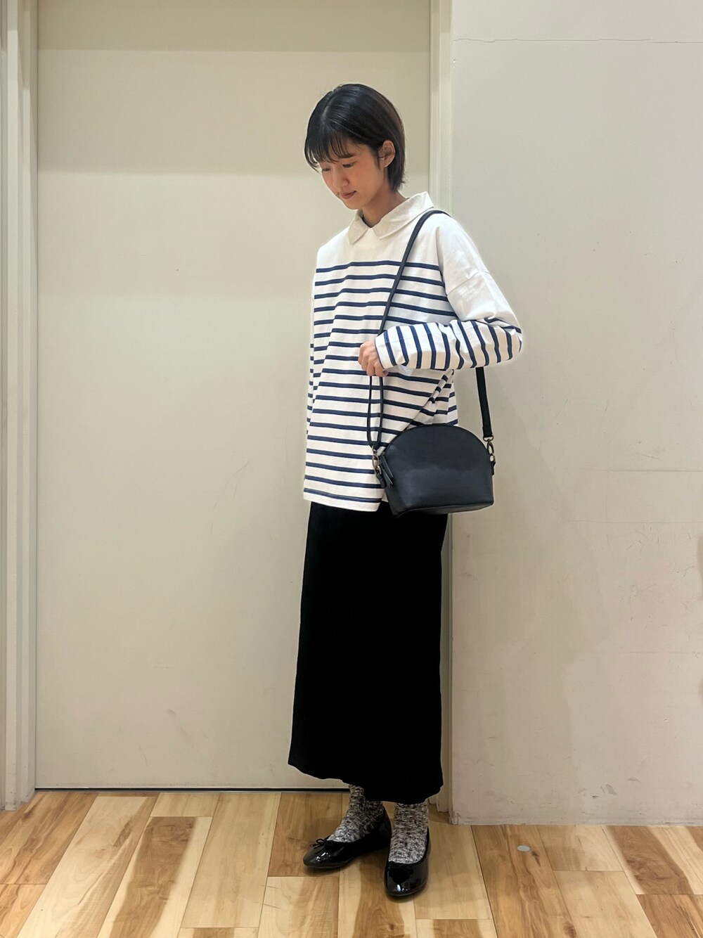 カジュアルなボーダーアイテムを Iラインのスカートと合わせたスッキリコーデ🪿 エナメルのバレエシューズを合わせて 上品に🩰