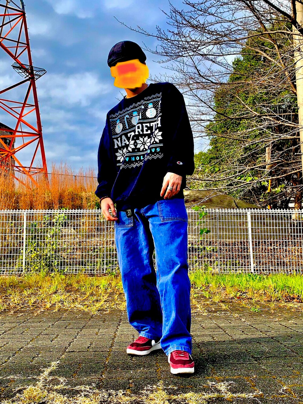 チャンピオンの古着スウェットコーデ このプリントに一目惚れで買ってしまった いいね👍お気に入りに登録よろしくお願いします!