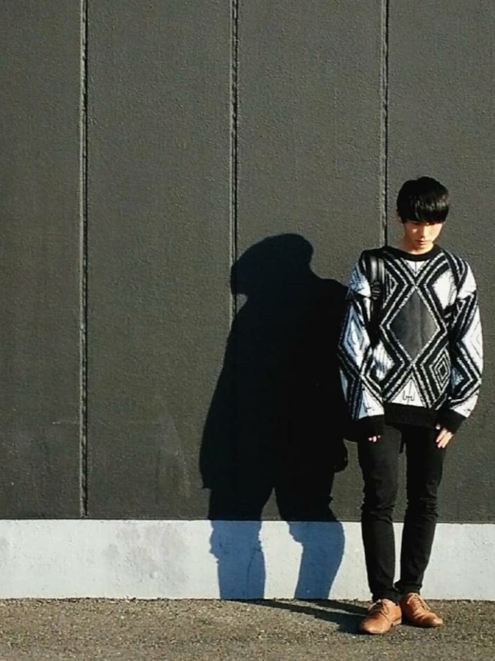 前大阪に行った時このニットを見つけて、即購入😅 お金が飛んでいく〜👋 派手なのでアウター無しでシンプルに黒のチノパンでコーデしてみました😶