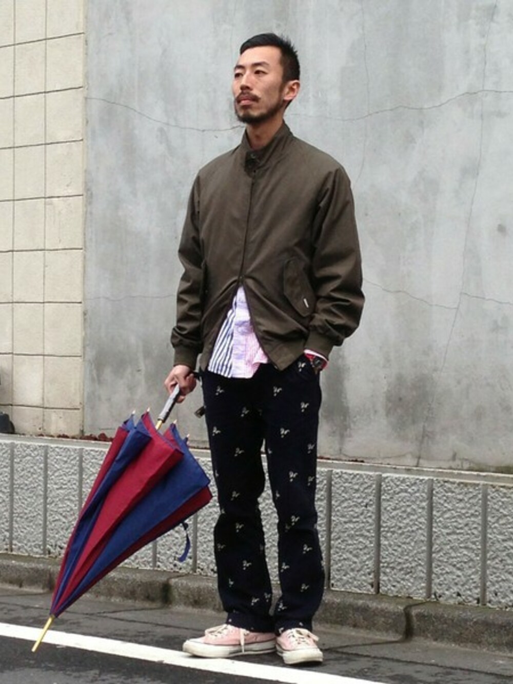 エンブロイダリーパンツを際立たせた、プレッピースタイル。アイビーカラーを髣髴させる、アンブレラをコーディネート。これで、憂鬱な雨もEnjoy!Fashion!!