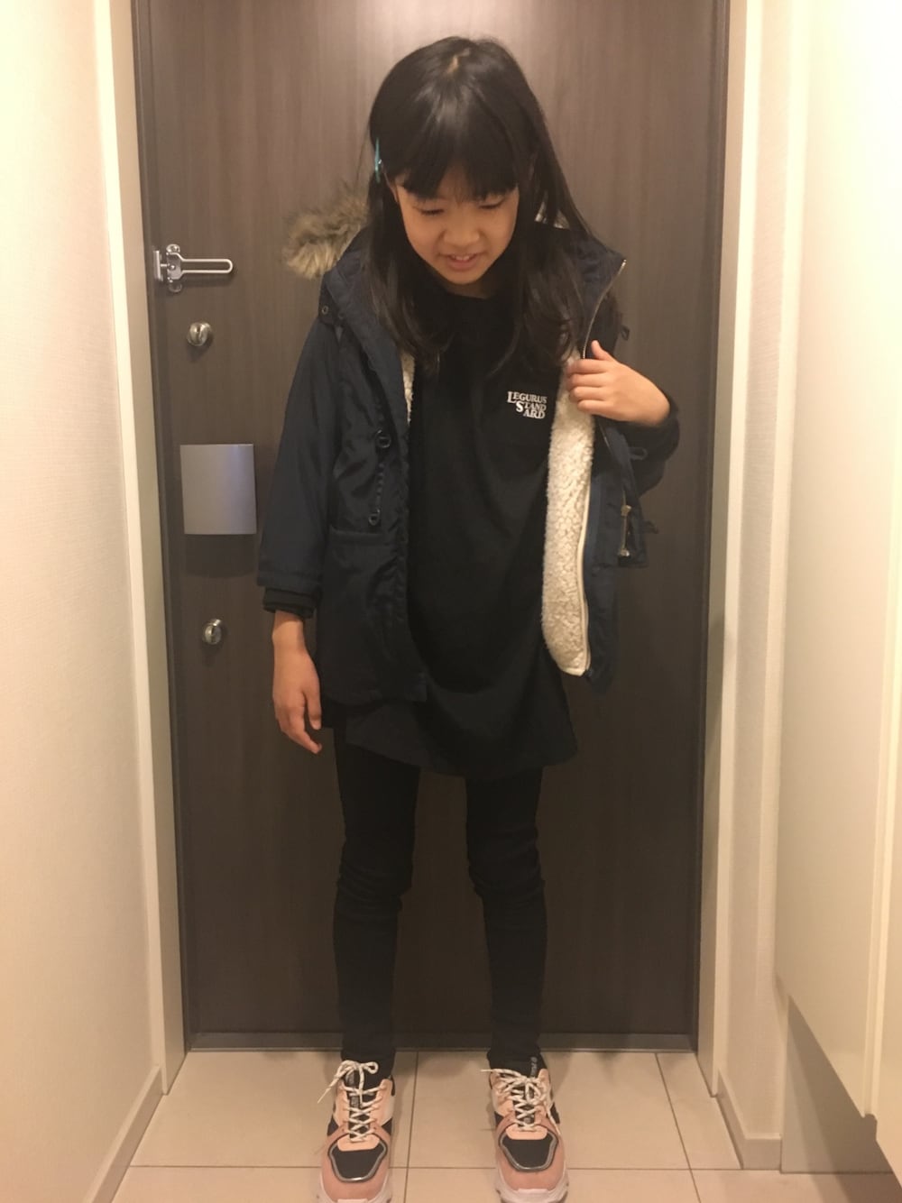 2020.02.10○○ rin*144cm アウター150cm トップスXL パンツ150cm スニーカーM レグルススタンダードのロンT着まわしコーデ☆☆ウエストをinせずに着るとおしりが隠れるくらいです♩ いいね、セーブ よろこびます(๑・̑◡・̑๑)