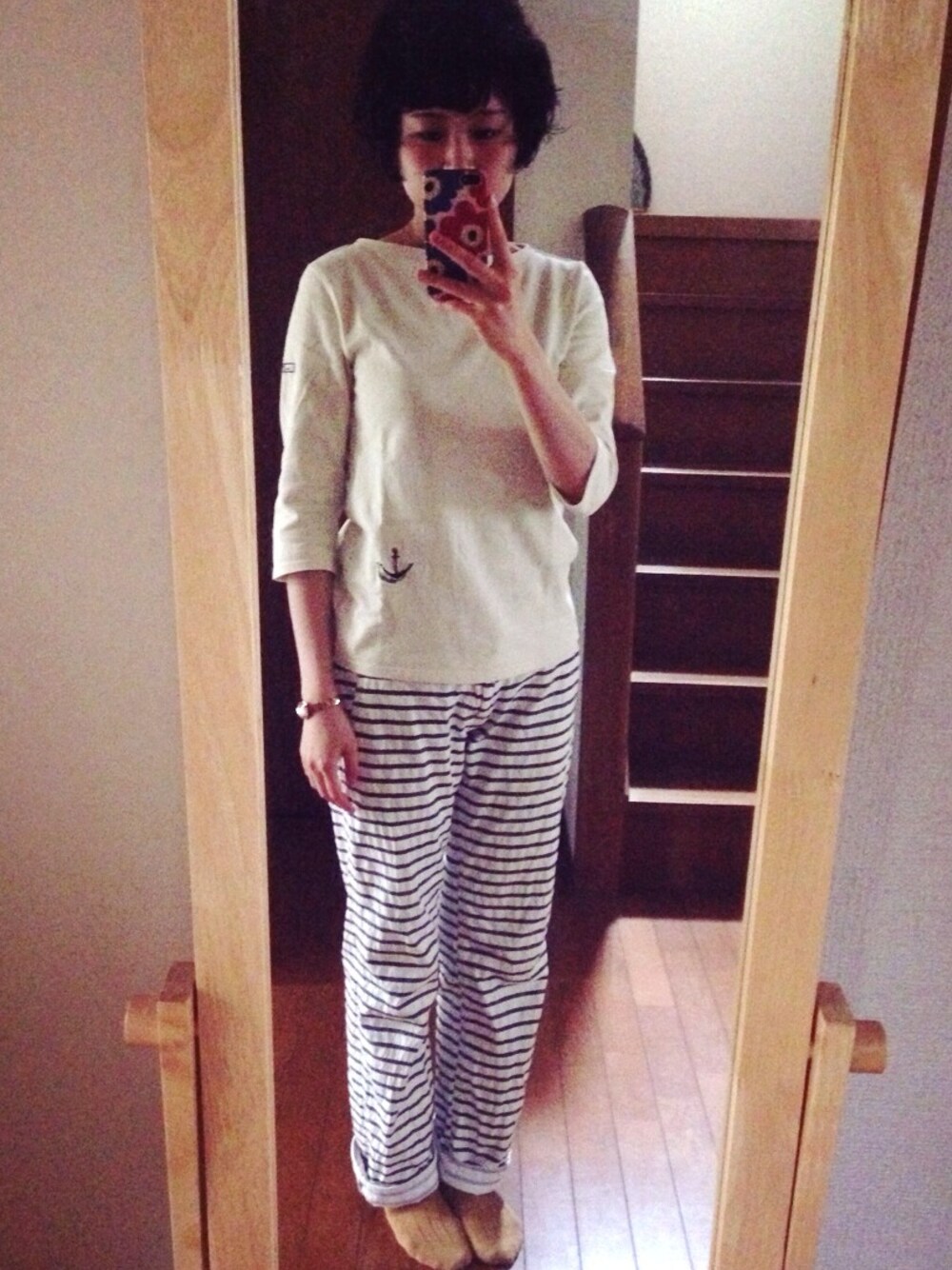 トップス:アーバンリサーチ パンツ:アーバンリサーチ たまたまアーバンリサーチづくし! トップスにはいかりマーク。 マリンコーデです。