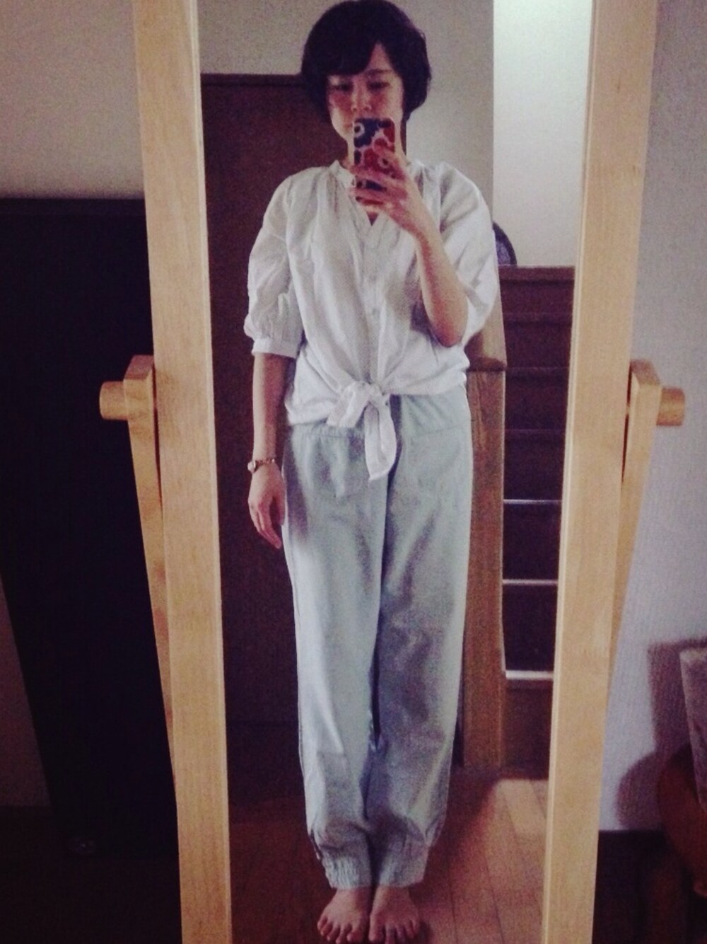 シャツ:ブランド不明 パンツ:KBF 昔のKBFシリーズ! 裾がかわいい! 見えにくいけど、ポケットつき。 トップスは水玉シャツ! なぜか写真では水玉が消えてもたけど。 前でくくってバカンス気分〜♪