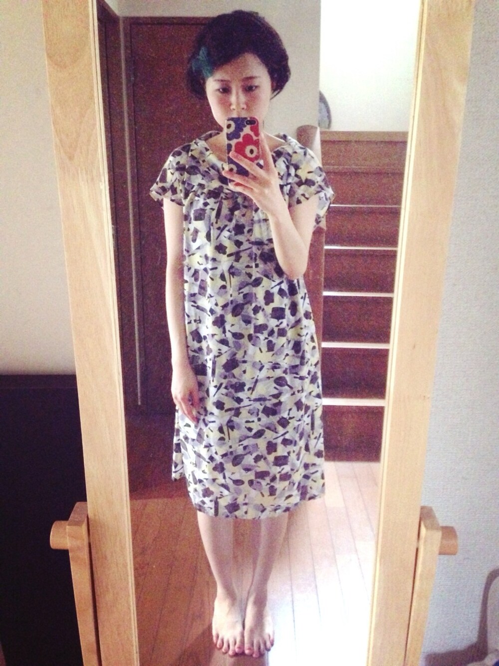 ワンピース:アトリエドゥサボン ヘアピン:KBF ワンピースの柄はキッチン用品! お鍋とか鍋つかみとか! 緑のリボンのヘアピンで髪をとめて、とことんガーリーにしました。
