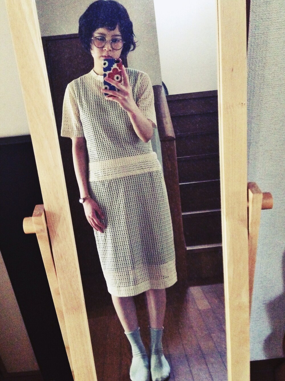ワンピース:お母さんのお下がり 靴下:靴下屋 眼鏡:GLCO お下がりシリーズ! 漂う昭和感。笑 首がつまってるところがポイント!