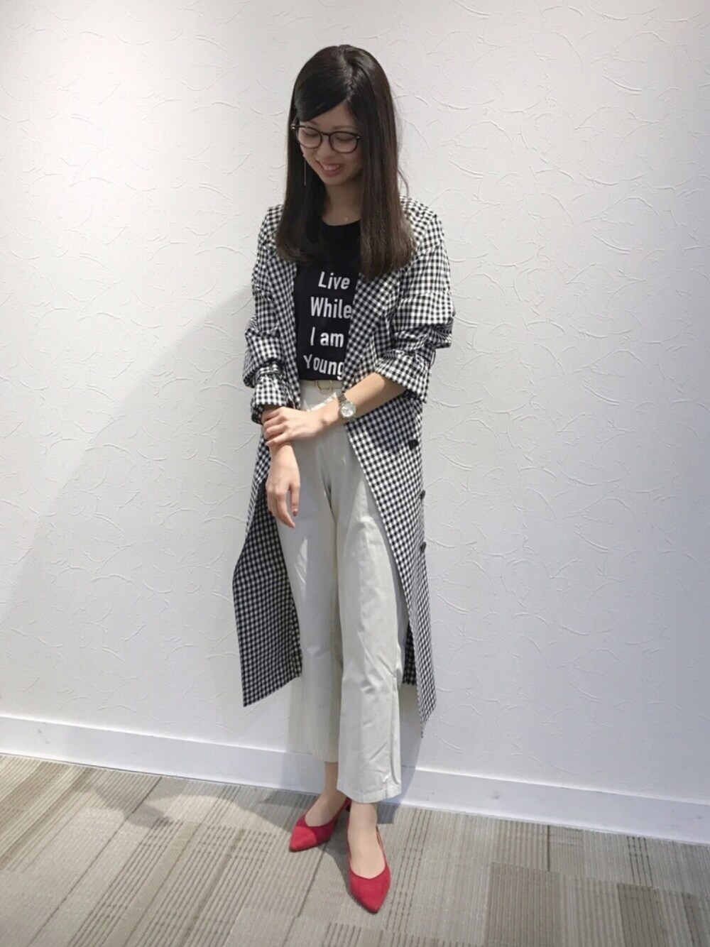 ギンガムチェックトレンチのモノトーンコーデ⚪️⚫️ 差し色にカラーパンプスを👠