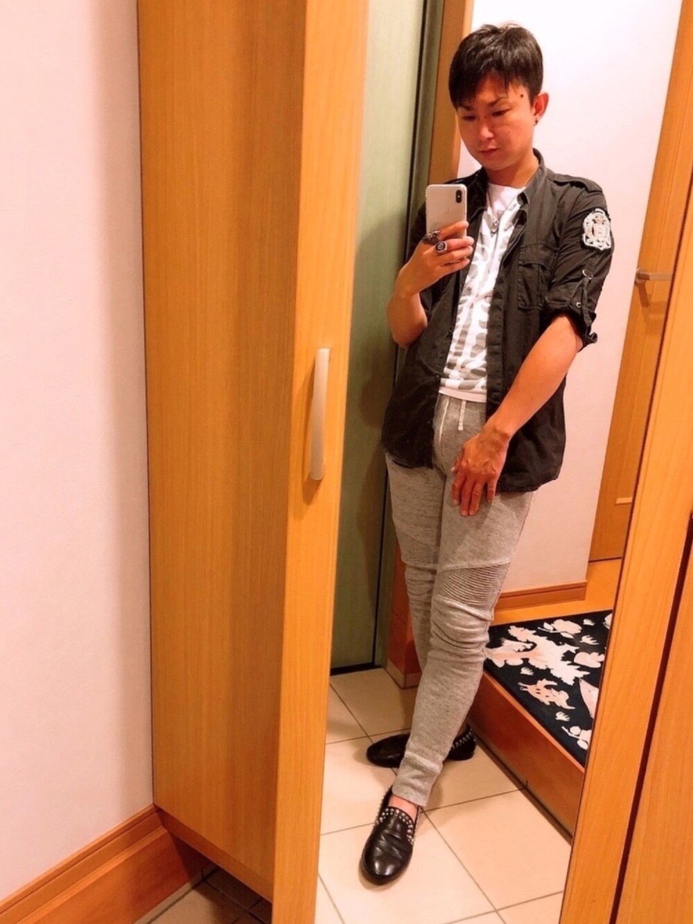 ミリタリーシャツ、スウェットパンツ、スタッズローファー いつもありがとうね。感謝!!