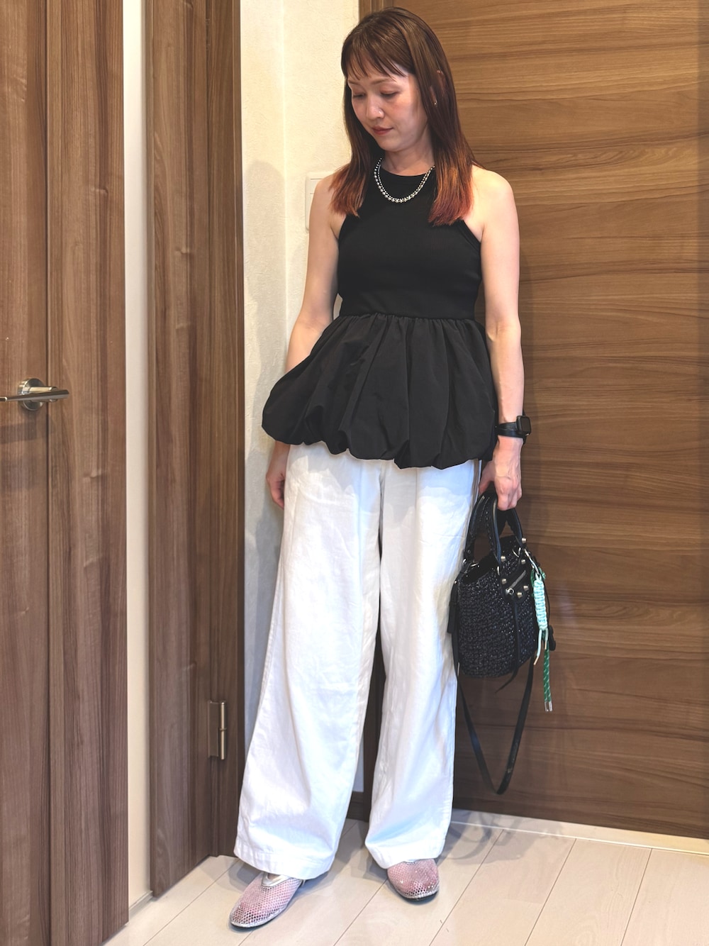 なんて事ないおでかけコーデ カップ付きペプラムアメスリが可愛い😍 メッシュパンプスはプチプラだけど本革!めちゃくちゃ気に入ってます🩶