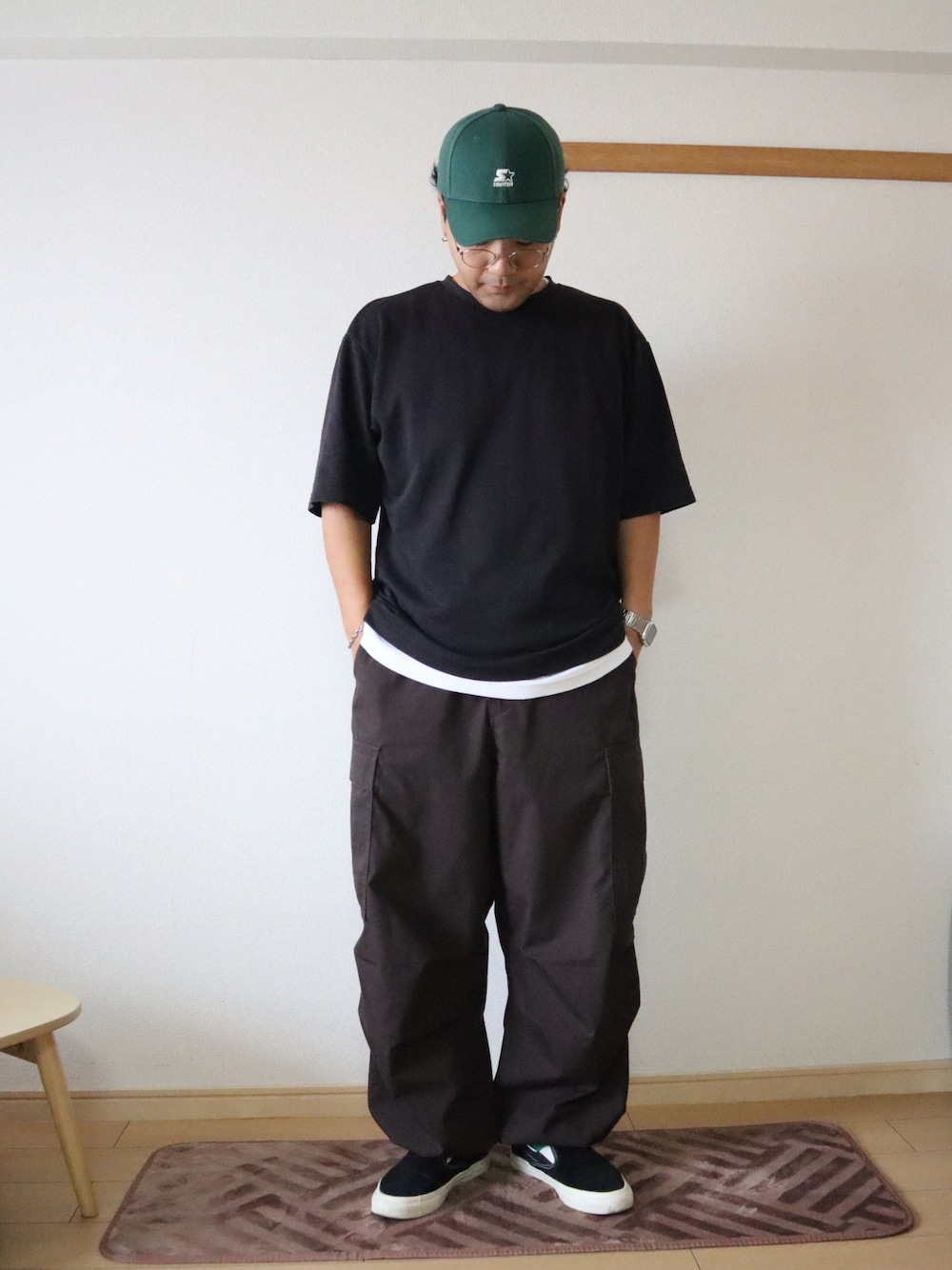 🟢×⚫️×🟤 上下とも暗めの色にして、てっぺんだけ緑キャップで色入れました🌳 暗い色とか好きなんですよね〜。落ち着く🪵 パンツはGUのスーパーワイドカーゴパンツのブラウンでLサイズです👖 ↓インスタに詳細載せてるのでよかったらフォローして下さい👍 @matt1_street