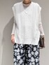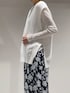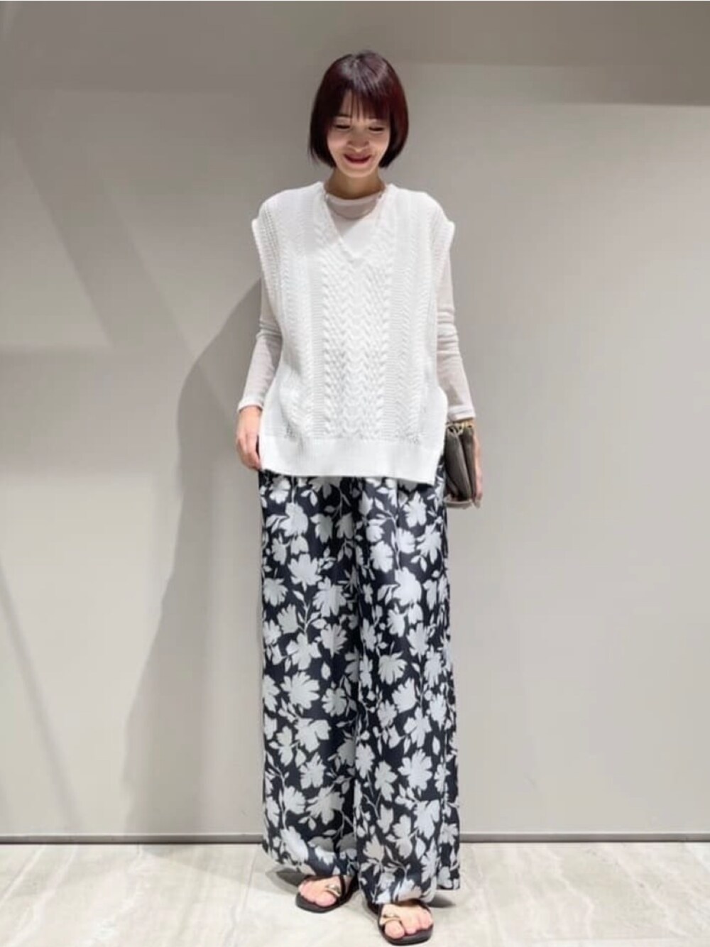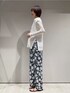 【ベスト: ケーブルニットベスト】 着用サイズ:Free ︎ ▼サイズ感 ゆとりのあるサイズ感。 前後差がある着丈で、後ろはヒップが隠れる長さなので安心です。 深めのサイドスリットが入ってるので、 ボリューム出が過ぎず、ワイドボトムスとの相性も 良いです。 ▼着心地・生地感 ドライタッチで、ほどよくムラ感のあるリネン混糸を使用。 軽やかな素材で夏まで着られます。 ▼コメント 深めのVネックデザインなので、 インナーにカットソーやシャツを合わせたりと レイヤードしやすいアイテムです。 夏はタンクトップやTシャツなどを合わせても◎ ロングシーズン活躍する一枚です。 【トップス: シアーテレコロングスリーブT】 着用サイズ:Free ▼サイズ感 体のラインが綺麗にでるやや細身のシルエット。 ▼着心地・生地感 サラッとしたドライタッチな生地感。 程よいシアー感と軽やかな素材で ロングシーズン着られます。 ▼コメント シンプルなデザインなので、 ジャケットなどのインナーとしても、 デニムなどカジュアルなコーデにも 馴染みやすく、幅広いシーンで重宝します。 【ボトムス:シルエットフラワーパンツ】 着用サイズ:38 ︎ ▼サイズ感 脚のラインを拾わず、太すぎないワイドシルエット。 ウエストの紐で調整可能かつ、 総ゴムなので楽で穿きやすいです。 ▼着心地・生地感 ポリエステル100%で扱いしやすく、 サラッと軽やかな生地でとても着心地良いです。 ▼コメント 存在感があるフラワー柄ですが、 落ち着いた色合いと 落ち感の綺麗なワイドシルエットが 大人上品な印象に。 シンプルなトップスと合わせて、 パンツを主役にしたコーディネートがおすすめです。 リラクシーな着心地と軽やか素材感なので、 夏にも活躍間違いなしです! 着用のパンツと同素材のトップス(No.32520010003)のご用意もございます。