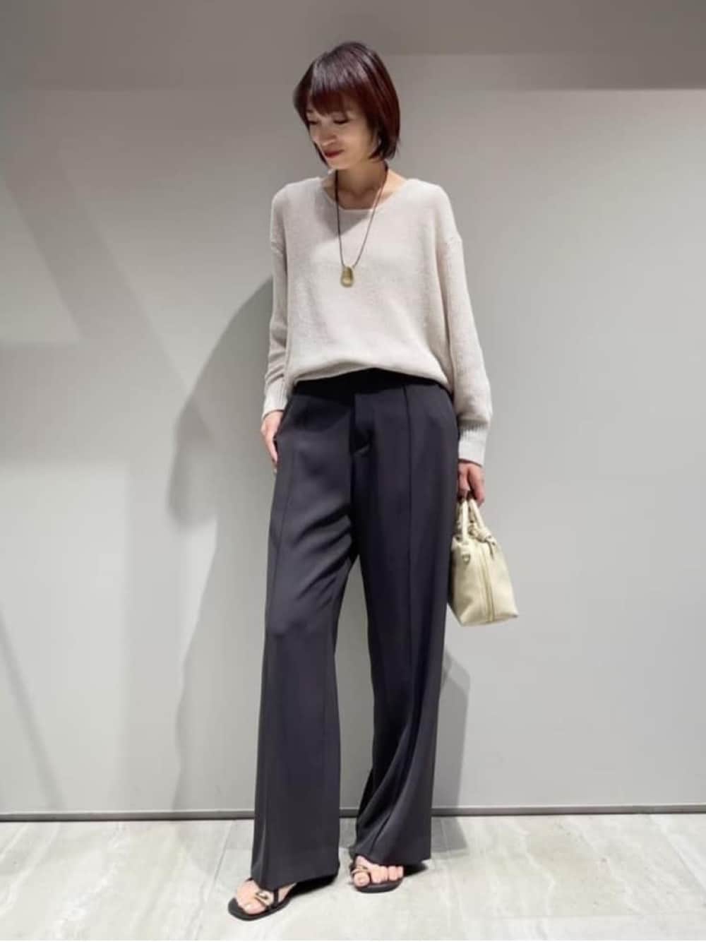 【トップス: ミックスカラードライコットンニット】 着用サイズ:Free ▼サイズ感 程よくゆとりのあるサイズ感。 深すぎず、鎖骨が綺麗に見えるVネックデザイン。 ▼着心地・生地感 コットン100% ドライタッチのサラッとした生地感で とても軽やかな着心地。 ▼コメント サラッとした軽やかな素材感が 今から初夏まで着られるコットンニット。 シンプルなデザインなので、 オフィスカジュアルから休日スタイルまで 着回ししやすいアイテムです。 深すぎないVネックですが、 開きが気になる方はロンTやシャツを合わせた スタイリングも良いです。 【ボトムス:ドライカルゼフルイドパンツ】 着用サイズ:38 ▼サイズ感 脚のラインを拾わない適度なワイドシルエットで 美脚が叶います。 ウエスト後ろはゴムなので、楽な穿き心地。 ▼着心地・生地感 シワになりにくい生地感で ストレッチが効いていて動きやすいです。 快適な穿き心地ながら、落ち感のある素材で きれいめな印象にも◎ ▼コメント ストレッチが効いていて リラックス感のある着心地ながら、 センタープレス風のピンタックが 美脚見えする優秀ボトムス。 オンオフ兼用に使える万能パンツです。 同素材のジャケット(No.32520080001)と 合わせてきちんと感のあるセットアップスタイルも おすすめです。