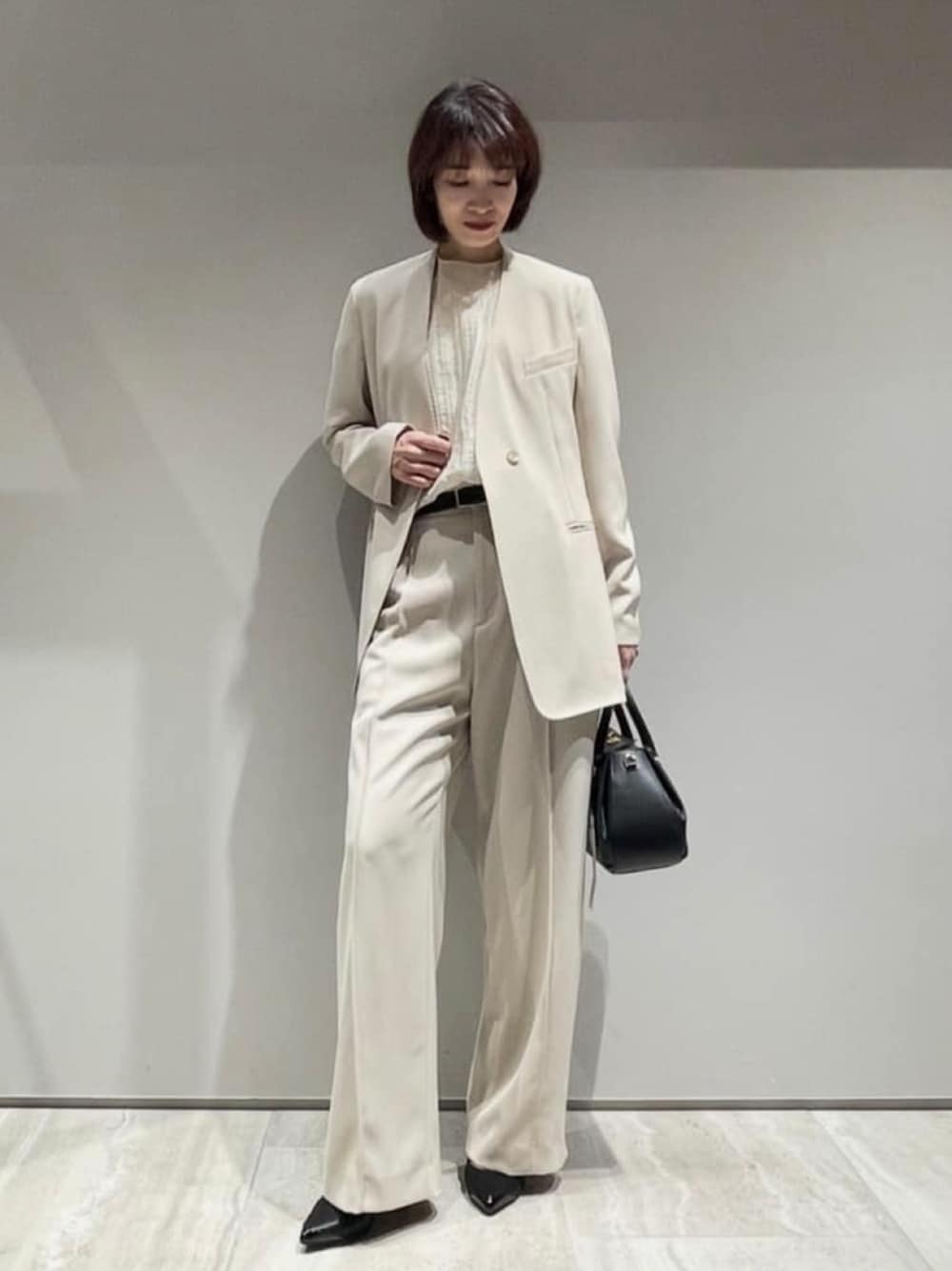 【ジャケット: ドライカルゼノーカラージャケット】 着用サイズ:38 ▼サイズ感 ゆったりサイズ感。 ヒップラインがしっかり隠れる着丈。 ▼着心地・生地感 2wayストレッチ素材なので動きやすく、 シワになりにくい生地感で 紫外線防止機能も備えた高機能性素材なのも 嬉しいポイント。 ▼コメント ゆったりと着られるサイズ感ですが、 ノーカラーデザインがスッキリとした印象で 縦長の美シルエットが叶います。 長めの着丈でガウンのようにさっと羽織れるので 春のアウター感覚で着られるジャケットです。 【ブラウス: シアークレープブラウス】 着用サイズ:Free ▼サイズ感 程よく肌離れするゆとりのあるサイズ感。 ボトムス問わずバランスのとりやすい着丈。 サイドにスリットがあり、 インもアウトもしやすいです。 ▼着心地・生地感 光沢ある楊柳生地でさりげない透け感が 上品な印象に。 シャリ感があり、とても軽やかな着心地。 ▼コメント 光沢ある楊柳生地と程よいシアー感が 上品な印象なブラウス。 お仕事やきれいめシーンにももちろん、 デニムと合わせてもカジュアルすぎず 大人上品な着こなしになれます。 【ボトムス:ドライカルゼフルイドパンツ】 着用サイズ:38 ▼サイズ感 脚のラインを拾わない適度なワイドシルエットで 美脚が叶います。 ウエスト後ろはゴムなので、楽な穿き心地。 ▼着心地・生地感 着用のジャケットと同素材。 快適な穿き心地ながら、落ち感のある素材で きれいめな印象にも◎ ▼コメント ストレッチが効いていて リラックス感のある着心地ながら、 センタープレス風のピンタックが 美脚見えする優秀ボトムスです。 着用のジャケットとセットアップスタイルで きちんとシーンにも、 ボトムスだけでカジュアルにも着られて オンオフ兼用で着回せる万能アイテムです。