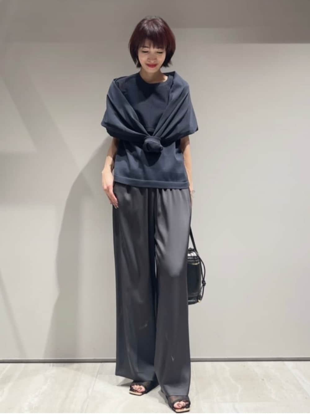 【トップス: シアーケープニット】 着用サイズ:Free ▼サイズ感 程よく肌離れするサイズ感。 ふんわりとした袖周りで長袖で着ても、 袖を通さず前で巻いても、 どちらも気になる二の腕を自然にカバーしてくれます。 後ろはヒップラインにかかるくらいの長さ。 インもアウトでもバランスがとりやすい着丈です。 ▼着心地・生地感 サラッとした生地感。 シアー感のあるケープ袖が重なっていて、 袖の通し方次第で長い季節で着られます。 ▼コメント 着用のように袖を通さず、巻いて軽やかにも、 袖を通して長袖としても着られる 2wayデザインです! 着方によって表情を変えて楽しめる レイヤードニット。 オンオフ兼用で着られて、春はもちろん 夏も着回せる着映えニットです。 【ボトムス: クールサテンパンツ】 着用サイズ:38 ▼サイズ感 ゆったりとしたシルエットながら、 落ち感がある素材で美ラインも叶うワイドシルエット。 ウエストは総ゴムで、ストレスフリーな穿き心地です。 ▼着心地・生地感 裏地なしの軽やかでサラリとしたサテン素材。 接触冷感&吸水速乾の機能性素材で 暑い季節も快適に過ごせます。 ▼コメント リラクシーな着心地とサテンの艶、 落ち感がきれいな素材とワイドシルエットが 大人リラックススタイルにおすすめの一本です。 接触冷感&吸水速乾の機能性素材なのも 嬉しいポイント。 同素材のトップス(No.32520010010)との セットアップスタイルもおすすめです。