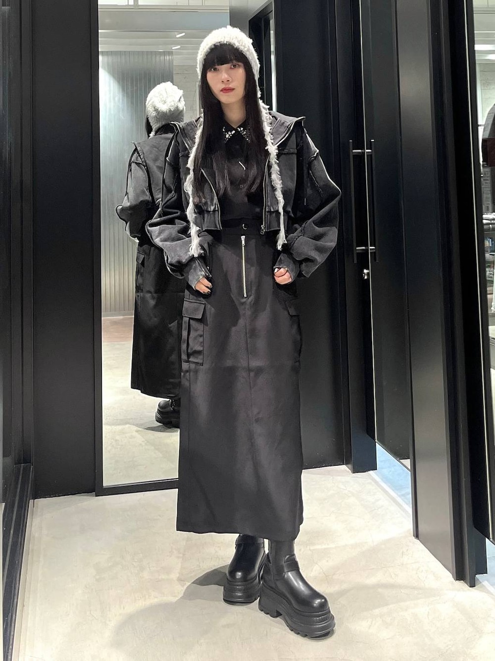 162cm/骨格ナチュラル ▶︎トップス ショート丈でバランスのとりやすいサイズ感 フードはジップで開閉可能 大きめの襟デザインにもなります ▶︎スカート ナローシルエットで 色のキリカエデザインがポイント! ストレッチの効いた素材で 履き心地楽でした🙆