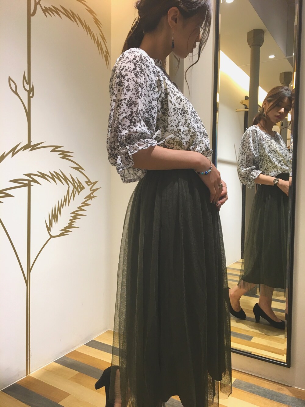 machu◡̈(Green Parks)のトップス「・m 小花柄オフショル7分袖ブラウス」を使ったコーディネート