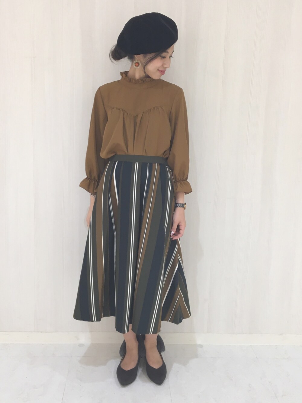 完全なる秋カラーづくし 主張の強いアイテム同士でも スカートのストライプに ブラウスのカラーがはいっていることで 全体のまとまり感up 足元にファーパンプスで トレンドもバッチリ