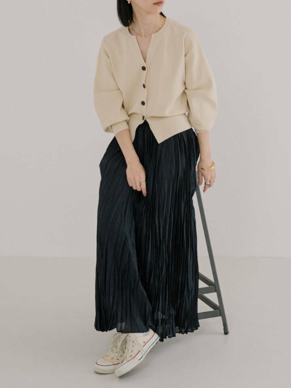 毛羽立ちにくいストレッチの効いたミラノリブ生地を使用したショートカーディガン。 袖のバナナカーブデザインやウエストにフィットする太めのリブが女性らしい丸みのあるシルエットを作り出し、スキッパーネックが程よい抜け感を演出。 柔らかく滑らかな素材感が上品な印象で、計算された絶妙なサイジングが一枚でも着映えするアイテムです。 派手すぎない上品なグリッタードットプリントを施した、大人の女性にぴったりのスカート。 抜け感がでるように若干の透け感がある素材にランダムプリーツを施しています。 腰のあたりはスッキリと見えるようフラットに、ギャザーも程良く入れることで裾が動く度に揺れる女性らしい印象に仕上げました。 可愛くなりすぎず、大人の女性がカジュアルに着ていただけるような美シルエットに拘った1枚です。
