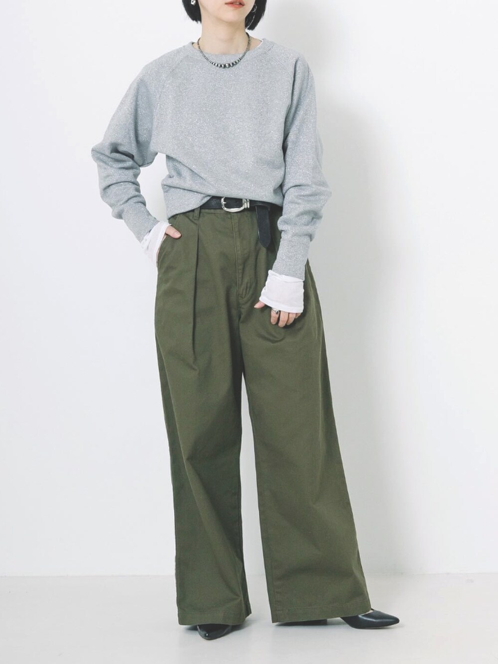 程良く光るラメが今年らしくスタイリングのアクセントになるコンパクトスウェット。 ベーシックなサイズ感が取り入れやすく、リブをつけたクロップド丈が幅広いボトムスとバランスが取りやすいよう仕上げました。 裏毛素材が肌触りも良く、身体に馴染む程良い厚みの生地が一枚でもレイヤードでも活躍。 鮮度のあるラメデザインが今年のワードローブに加えておきたいアイテムです。 SHIOTAに一から別注したチノパンツは、細部にもこだわり抜いた一着。 昨年、秋冬に好評だったワイドデニムの素材替えで、腰回りがスッキリと見えるようヒップ周りを削り、バックポケットの位置も小さ目にすることでどの角度から見ても綺麗なバランスになるよう何度も微調整を加えました。 カジュアルな印象の強いチノパンツですが、しっとりとした質感やフロントのワンタックデザインがきれいめのアイテムとも高相性。 SHIOTAの丁寧なモノづくりを実感できる、他にはない唯一無二のチノパンツが完成しました。