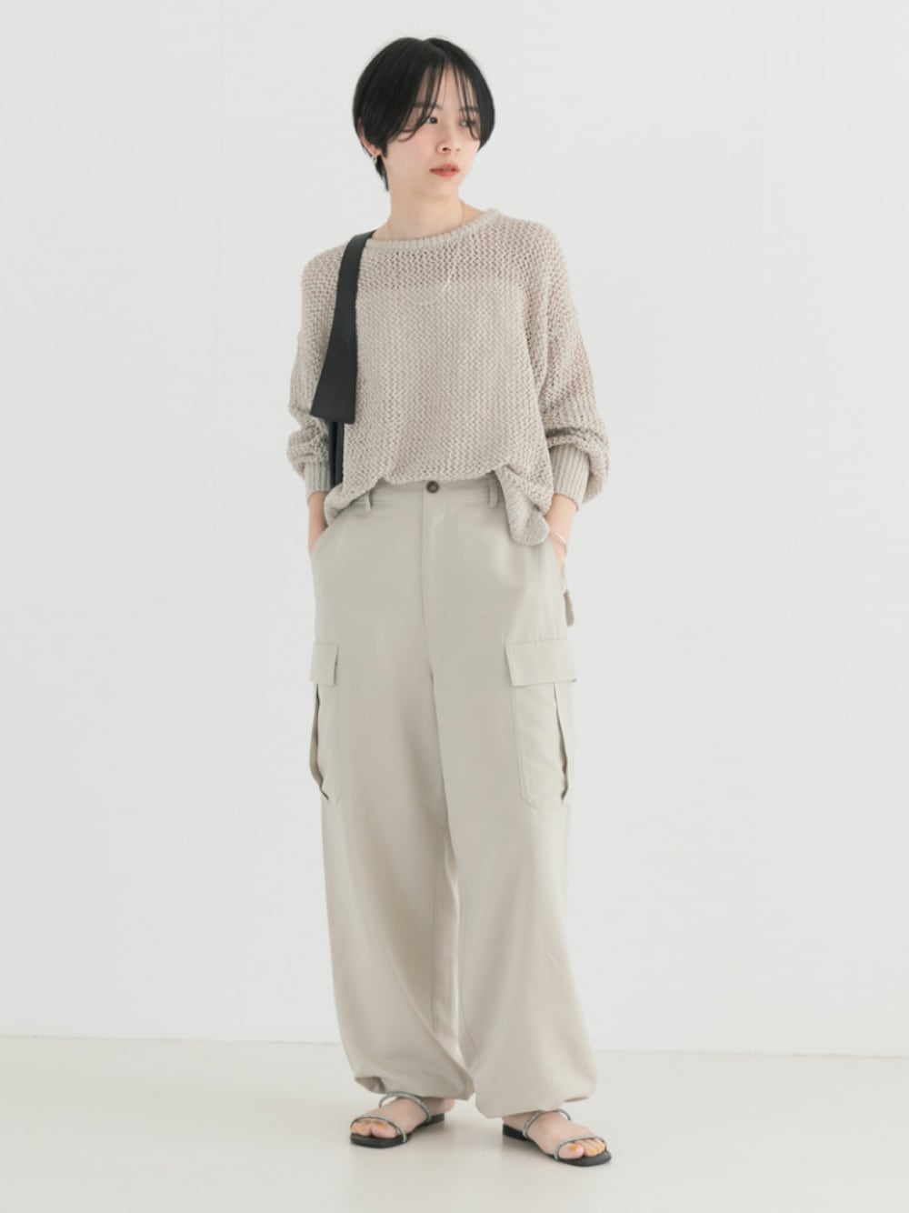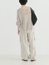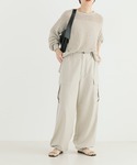 毎年人気の透かし柄カーディガンと同素材のプルオーバーニットをご用意。 肩のラインに減らし目を入れることで継ぎ目のボリュームを抑え、より肩馴染みが良くなるよう仕上げました。 肌離れの良い柔らかな素材が華奢なインナー合わせでも着ていただきやすく、気温の上がるこれからの季節にも快適な一着。 丈には前後差をつけることで気になる腰周りをカバーし、程良い開きの襟ぐりやサイドスリットがスタイリングに程よい抜け感を演出。 ざっくりとした透かし編みのヘルシーな透け感が女性らしく、シンプルなデザインがどんなコーディネートにもマッチするアイテムです。 ワーク要素の強いカーゴパンツを、落ち感と光沢のあるサテン地を使用することで女性らしく穿いていただけるよう仕上げました。 ゆとりのあるストレートシルエットですが、裾のドローコードを絞ればシルエットを変えて楽しんでいただけます。 フロントはシンプルに仕立て、トップスをインしてもキレイにまとまるデザインに。 また、バックにはリラックス感を追求したゴムを施し、見た目の上品さと穿き心地にも拘りました。