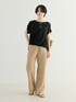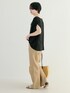 裾ゴムを入れたタックイン風のデザインが動きをプラスしてくれるカットソーをご用意。 ドレープ感の出るとろみのある生地やネックラインがきれいに見えるボートネックデザインが上品な印象。 前後差のある着丈やフレンチスリーブが身体の気になる部分もしっかりとカバーし、オンオフ問わず着回せるデザインが活躍必至のアイテムです。 着込むほどに風合いの増すリネン100%の柔らかく清涼感のある素材を使用したイージーパンツ。 膝周りの幅を少し削り、立体的にバイアスカットされたセミフレアシルエットが美脚、脚長効果も抜群な一着。 ウエストのゴムギャザー仕様がリラックスした穿き心地で、内側には紐がついているのでサイズ調節も可能。 シャツやカットソーと合わせたラフなスタイルはもちろん、ワンピースなどとのレイヤードスタイルにも活躍します。