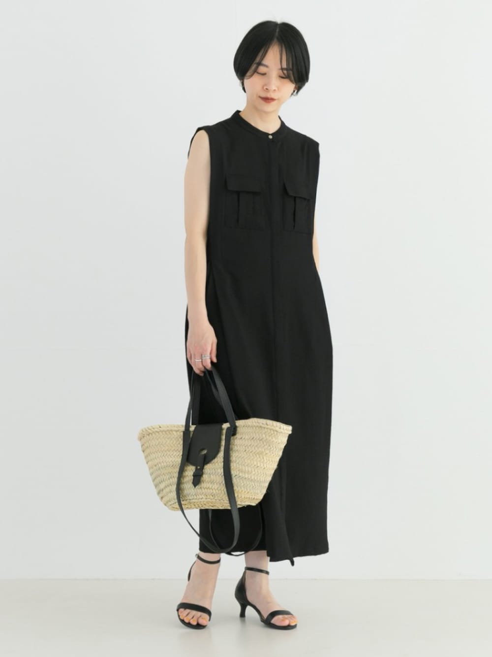 一枚でも羽織でも、着こなし方で雰囲気が変わるジレワンピースは、ドライタッチな落ち感のある生地が肌離れも良く、身体のラインを拾わないゆとりのあるサイズ感がリラクシーな着心地。 少し肩にかかるノースリーブデザインが程よく二の腕をカバーし、前開きの比翼デザインやバンドカラーがすっきりとした印象に。 シワになりにくくご自宅での手洗いが可能なイージーケア素材も嬉しいポイントで、ウエストサイドのベルトを絞ればメリハリのあるシルエットが完成します。