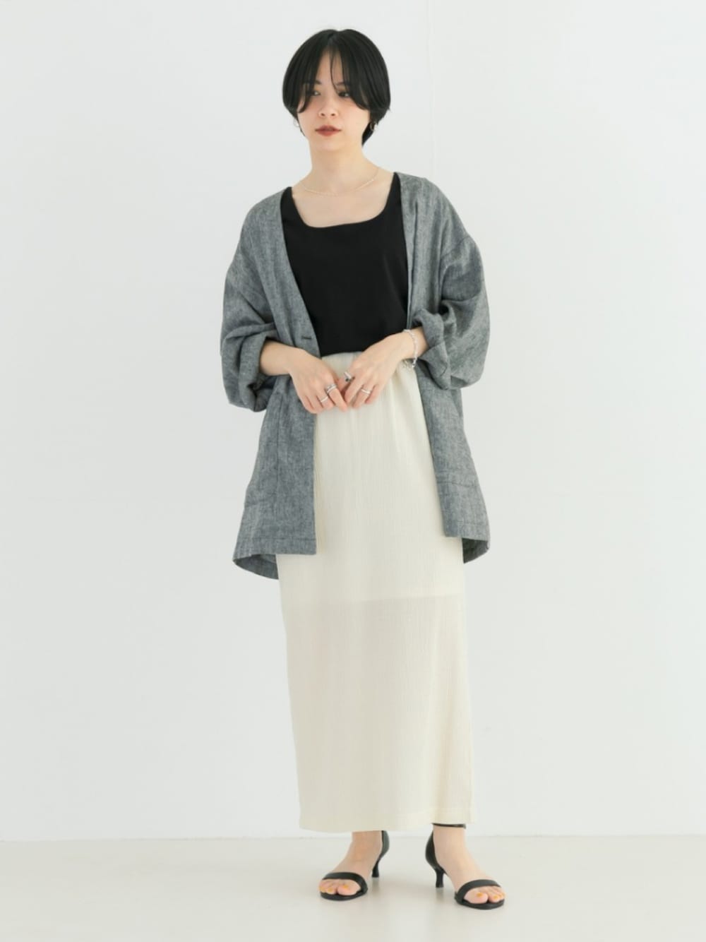柔らかく肌当たりの良いリネン混素材のノーカラージャケットは、きちんと感はありながらもルーズなデザインがラフに着ていただける一着。 表面にリネンの特徴でもあるネップや節を出したナチュラルな風合いが特徴で、細かな織柄がシンプルなアイテム合わせでもコーディネートに表情をプラス。 ノーカラーデザインや肩の落ちるドロップショルダーが女性らしい抜け感を演出し、合わせるアイテムを選ばないシックなカラー展開がマルチに活躍します。 シャーリングの表面感があるカットソー素材を使用したストレートスカート。 身体の動きに合わせて伸縮する程良いフィット感や、ウエストのゴム仕様が締め付けのないストレスフリーな穿き心地。 しっかりと長さのある着丈が縦のラインを強調し、ボリュームのあるトップスとも相性抜群。 ウエスト部分は外にゴムが見えない仕様のため、タックインスタイルもきれいにまとまります。 単色で濃淡をつけた柄見えする生地がスタイリングに立体感を生み、シンプルなアイテム合わせでも表情のあるスタイリングが仕上がります。