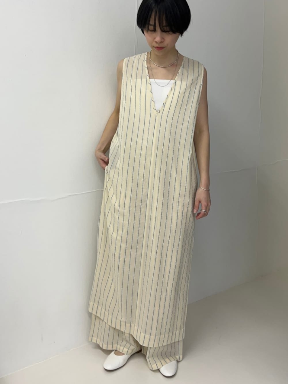 爽やかなストライプ柄のワンピース。 南インドの上質な綿花を生産するタミールナドゥ州でとれたコットンを使用。 上品なふくらみとしなやかな風合いで、軽く通気性の良い素材です。 プリントはURだけのオリジナル。ぽこぽことした表面感のある生地が可愛らしく、他にはない一着に仕上がりました。 デザインは、すっきりとしたストレートシルエット。サイドに深めのスリットを入れることで、ボトムスとのレイヤードを楽しめます。 また、クルーネックとVネックの前後2WAY仕様で、その日のスタイルに合わせて、首元の雰囲気を変えていただけます。 爽やかなストライプ柄のワイドパンツ。 南インドの上質な綿花を生産するタミールナドゥ州でとれたコットンを使用。 上品なふくらみとしなやかな風合いで、軽く通気性の良い素材です。 プリントはURだけのオリジナル。ぽこぽことした表面感のある生地が可愛らしく、他にはない一着に仕上がりました。 カジュアルな素材ながらも、フロントにタックを入れることで、きれい目な要素もプラス。 ウエストはゴム仕様で、内側の紐でサイズ調節が可能。ウエストを一回折ると、丈感も調整していただけます。 コットンの裏地付きも、嬉しいポイント。通気性や肌