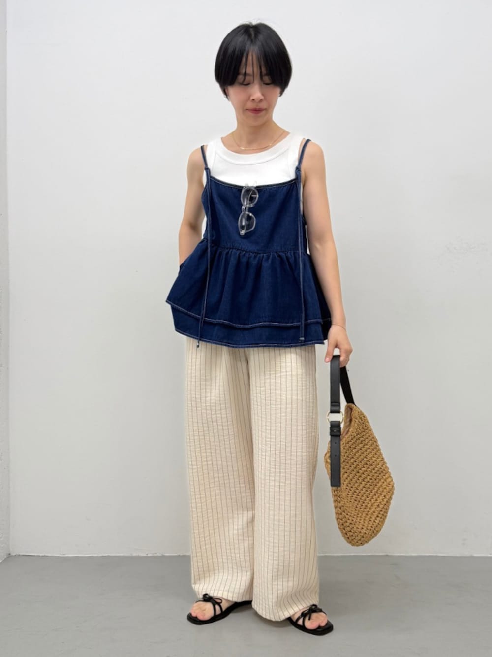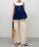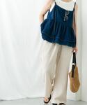 トレンド感たっぷりのデニムビスチェキャミソール。デニム素材ならではの程よいハリ感があり、シルエットを美しく演出します。インナー次第でさまざまなスタイリングが楽しめるのが魅力。Tシャツやシアートップスと合わせればカジュアルに、ブラウスと合わせればフェミニンな雰囲気にも◎カジュアルにも大人っぽくも着こなせる万能ビスチェ。季節を問わず、さまざまなコーディネートを楽しめます。一枚でコーデの主役になるアイテムです。 軽やかでさらっとしたポリエステル素材が心地よい、ストライプ柄のイージーパンツ。ウエストゴムでストレスフリーな履き心地。さらにウエストの紐で自分好みのフィット感に調整可能です。裏地付きなので透け感を気にせず安心して着用できるのも嬉しいポイント。同生地のビスチェも展開しているので、セットアップで着れば一気に旬のコーデが完成。きれいめブラウスと合わせて大人っぽく仕上げるのもおすすめです。