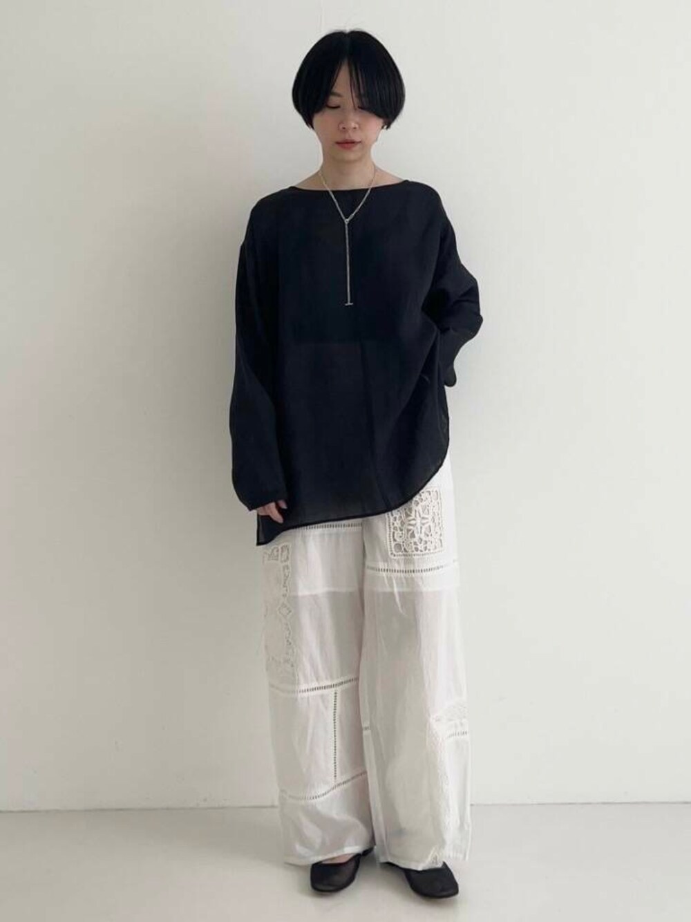 さらりとした薄手のラミー100%素材を使用したブラウスが再登場。 昨年の好評を受けてデザインをリニューアルし、よりスタイリッシュな印象に仕上げました。 身体のラインを拾わないゆったりとしたサイズ感で、広めに開いた衿ぐりが抜け感を演出。Tシャツ感覚で気軽に着られるベーシックなデザインなので、着回しのしやすさも魅力です。 通気性の良い素材なので、真夏の日よけ対策にも活躍。暑い時期でも快適に過ごせます。 ボトムスは、きれい目なスラックスを。柄物のイージーパンツとも相性抜群です。 小柄な方には、袖口をロールアップして手首を見せるスタイルがおすすめ。 レースとオリジナルの刺繍柄をパッチワークしたイージーパンツ。 インドのコットンボイル素材を使用し、華奢な素材感とレースの組み合わせが絶妙にマッチ。 ゆったりとしたシルエットが快適さを提供し、リラックスカジュアルなスタイルに適しています。 トップスに同素材のパッチワークレーストップス(URA5-23T002)を合わせると、セットアップスタイルを楽しめます。華奢なサンダルやアクセサリーをプラスすれば、より艶感のあるコーディネートに。