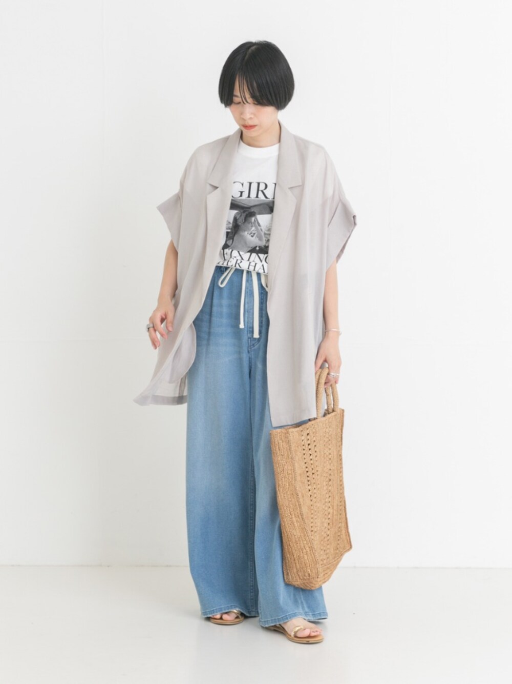 一枚でこなれ感を演出できるシアージャケット。 シャツ感覚でさらっと羽織れるゆったりとしたシルエットで、ワンパターンになりがちな夏のスタイリングに活躍します。シアー素材で涼しく着られるのも嬉しいポイント。 キャミソールやタンクトップの上から羽織っていただくと、ヘルシーで今年らしい着こなしに。プリントTEEなど、カジュアルに合わせていただくのもおすすめです。 柔らかく伸縮性のあるリネン混素材を使用したデニムパンツ。 明るいブルーにヴィンテージライク風合いが、これからの季節にぴったり。 ルーズなシルエットにフロントのタックが、着心地の良さと体型カバーを両立します。 ウエストの白の紐がアクセントで、サイズ調整が可能。ストレスフリーな穿き心地も魅力です。 身長別で選べる3サイズ展開も嬉しいポイント。 シアー素材のトップスを合わせると、トレンドのスタイリングを楽しめます。ジャケットとの相性も抜群。足元はきれい目なシューズや、華奢なサンダルがおすすめです。