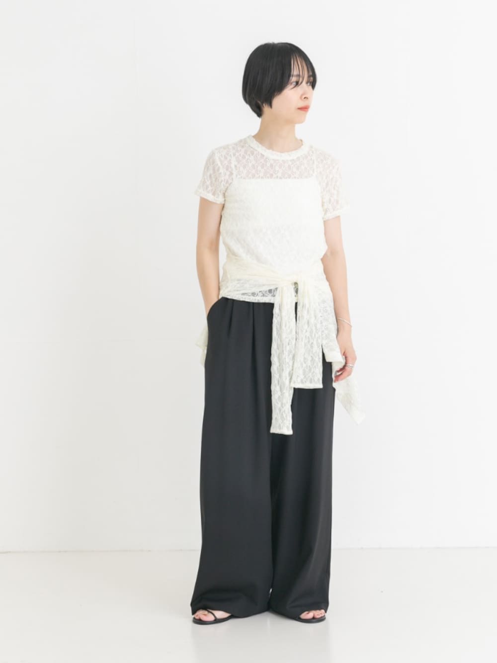 一点投入でスタイリングが華やぐレースTEE。 薄く、肌触りの良いストレッチレースを使用。着心地の良さにもこだわりました。 袖は短めのコンパクトなデザインで、涼しげな印象に。 シンプルなボトムスと合わせても、新鮮さのあるスタイリングに仕上がります。 ベストやジャケットのインナーとしても活躍。季節の変わり目など、ロングシーズン着回しが可能です。 同素材のシャツとのレイヤードもおすすめ。 上品で抜け感のあるレース素材が目を引くブラウス。 薄手で伸縮性のあるストレッチレースを使用。肌馴染みがよく、落ち感があるため、すっきりとした印象で着用できます。 前を閉じてプルオーバー風に着ればきちん感のあるスタイリングに。羽織りとして着るとリラックスした雰囲気に仕上がります。 キュプラ素材のボトムスと相性が抜群。快適さと上品さを楽しめます。 カジュアルなバッグやサンダルを合わせると大人のリラックススタイルが完成。デニムやスウェットパンツなど、カジュアルアイテムとのスタイリングもおすすめです。