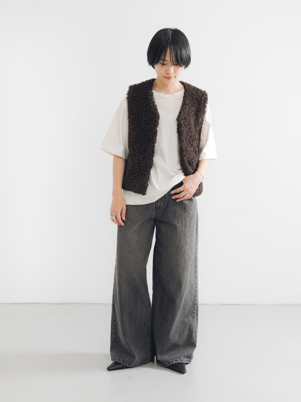 上質な「ECOPEL」のファーが、秋冬の装いを格上げするベスト。 本物の毛皮のような柔らかさと美しい光沢を持つ「ECOPEL」のファーを使用。 トレンドのカールした毛並みが特徴で、シンプルな装いに羽織るだけで、トレンド感と着映えを叶えます。 身幅がありながらも広がりすぎない計算されたシルエットとすっきりとしたVネックのデザインが、スマートな印象を演出します。フロントのホックを留めればジレのように、開ければ軽やかなベストとして、着こなしの幅が広がる一枚です。 シャツとスラックスにジレのように羽織ったり、シンプルなカットソーやワンピースの上にベストとして合わせるのもおすすめです。