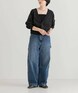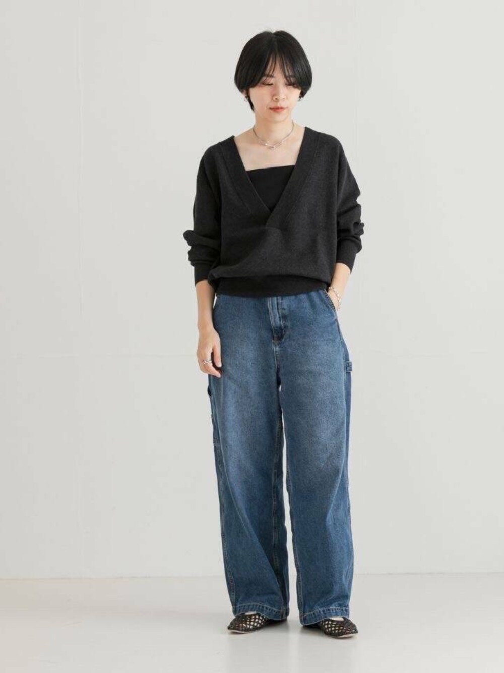 メランジ調のさり気ないミックス生地がポイントのVネックニットを、スタイリングに馴染みの良いベーシックカラーでご用意。 ウエストにフィットする太めのリブが女性らしい丸みのあるシルエットを作り出し、着丈の調節が可能なため、ボリュームのあるボトムスとも高相性。 深めのVネックが抜け感のあるデザインで、合わせるインナーでテイストの変化を楽しめる一着です。 ワーク感のあるペインターパンツのディティールを取り入れたデニム。 ルーズなシルエットに、柔らかなデニム生地がライトな着用感を実現。シーズンレスで長くご愛用いただけるアイテムに仕上げました。 着丈に差をつけた2サイズでのご用意のため、お好みのシルエットに合わせてお召しいただけます。 スタイリングに取り入れるだけでこなれ感のでる、ワードローブに加えておきたい一本です。