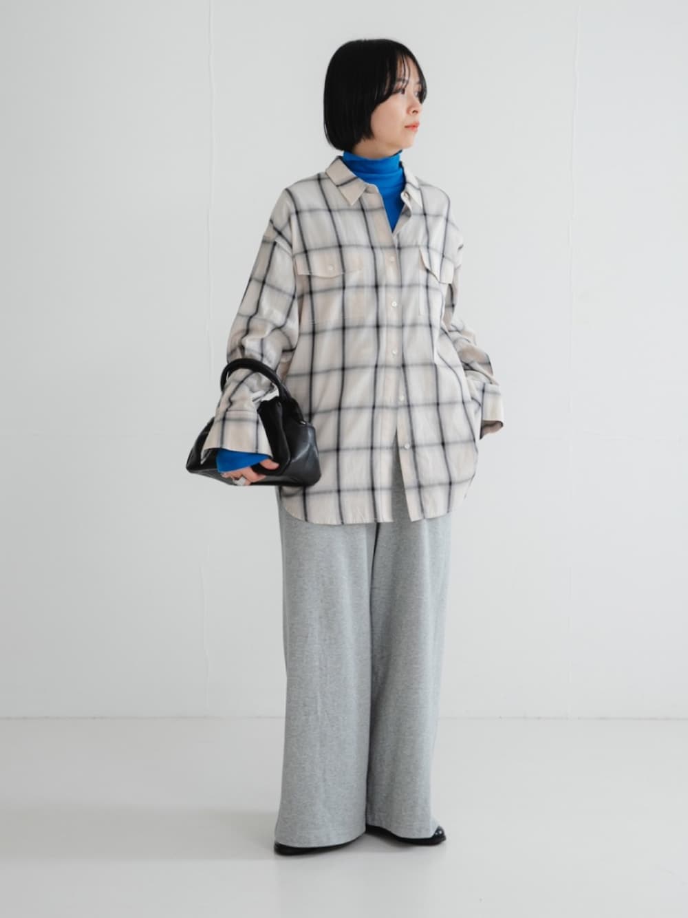 色のグラデーションが特徴的なオンブレーチェック柄です。 境界線がはっきりしない柔らかな柄なので、コーディネートに馴染みやすく、チェック柄が苦手な方にも取り入れやすい一枚です。 綿100%のなめらかな生地を使用。程よい落ち感のあるゆったりとしたシルエットで、女性らしい抜け感のある着こなしを演出します。 一枚でさらりと着るのはもちろん、タートルネックやカットソーなどを重ねたレイヤードスタイルもおすすめ。腰に巻いてコーディネートのアクセントに使えば、今年らしいムードが高まります。 肌触りの良いミニ裏毛素材のリラックスワイドパンツ。 程よく軽やかな生地なので、季節長く着用いただけます。 ウエストは伸縮性のあるゴム仕様。内側に紐が付いているので、身長や体型に合わせて、好みの位置で穿いていただけます。 ほど良いワイドシルエットは落ち感があり着ぶくれしないため、カジュアルになりすぎずラフで大人っぽい抜け感を演出。 シャツやジャケットと合わせれば、きちんと感がプラスされ、今年らしいスタイルに。