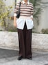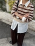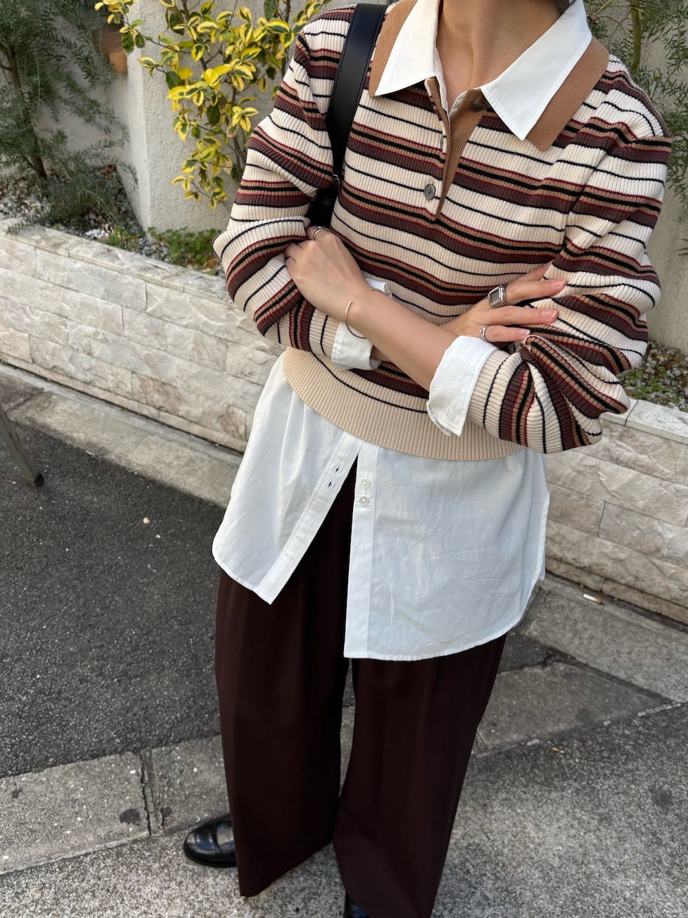 コットンシルクの上質リブが心地よい、マルチボーダーポロニット。 コットンシルク混の程よい肉感リブ素材を使用。 しなやかな着心地で、身体のラインをきれいに見せてくれます。程よい伸縮性があり、ストレスフリーで着用いただけます。 オリジナルのマルチボーダーが、コーディネートのさりげないアクセントに。 ウエストで自然に留まるコンパクトなサイズ感が今年らしいデザインで、ワイドボトムスとも相性抜群です。 華奢見えも叶い、着るだけで大人のこなれスタイルが完成します。 長い季節で着用でき、春先にはデニムとローファーやショートブーツで抜け感をプラスするのがおすすめ。ワイドパンツやタイトスカートに合わせ、ニットを主役にしたシンプルなコーディネートも楽しめます。
