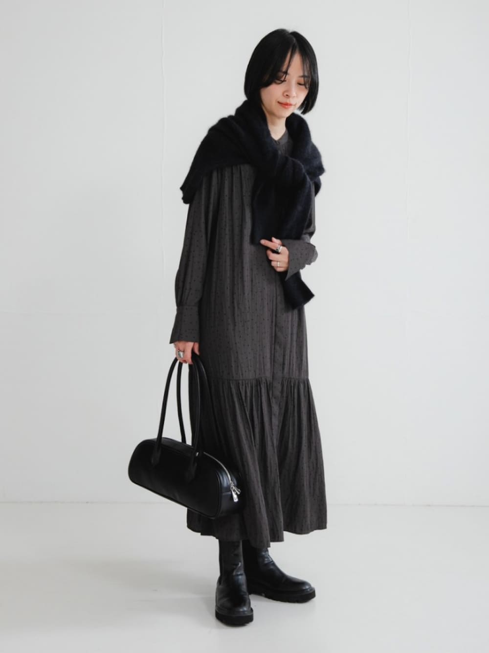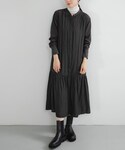 品のある微光沢が魅力の、ギャザーティアードワンピース。 軽やかな素材と甘すぎないティアードデザインが、大人の女性にぴったりな一枚です。 フロントは比翼仕立てになっており、すっきりとしたクリーンな印象に。 裾に向かってふんわりと広がるティアードシルエットが華やかさを演出します。一枚でさらりと着るだけで様になるデザインで、パンプスやブーツを合わせるとシックな着こなしに。パンツをレイヤードして着たりカジュアルダウンするのもおすすめです。 秋口にはジャケットやロングカーディガンを羽織ったり、冬にはニットを重ねてスカートのように着るなど、季節を問わず様々な着こなしを楽しめます。