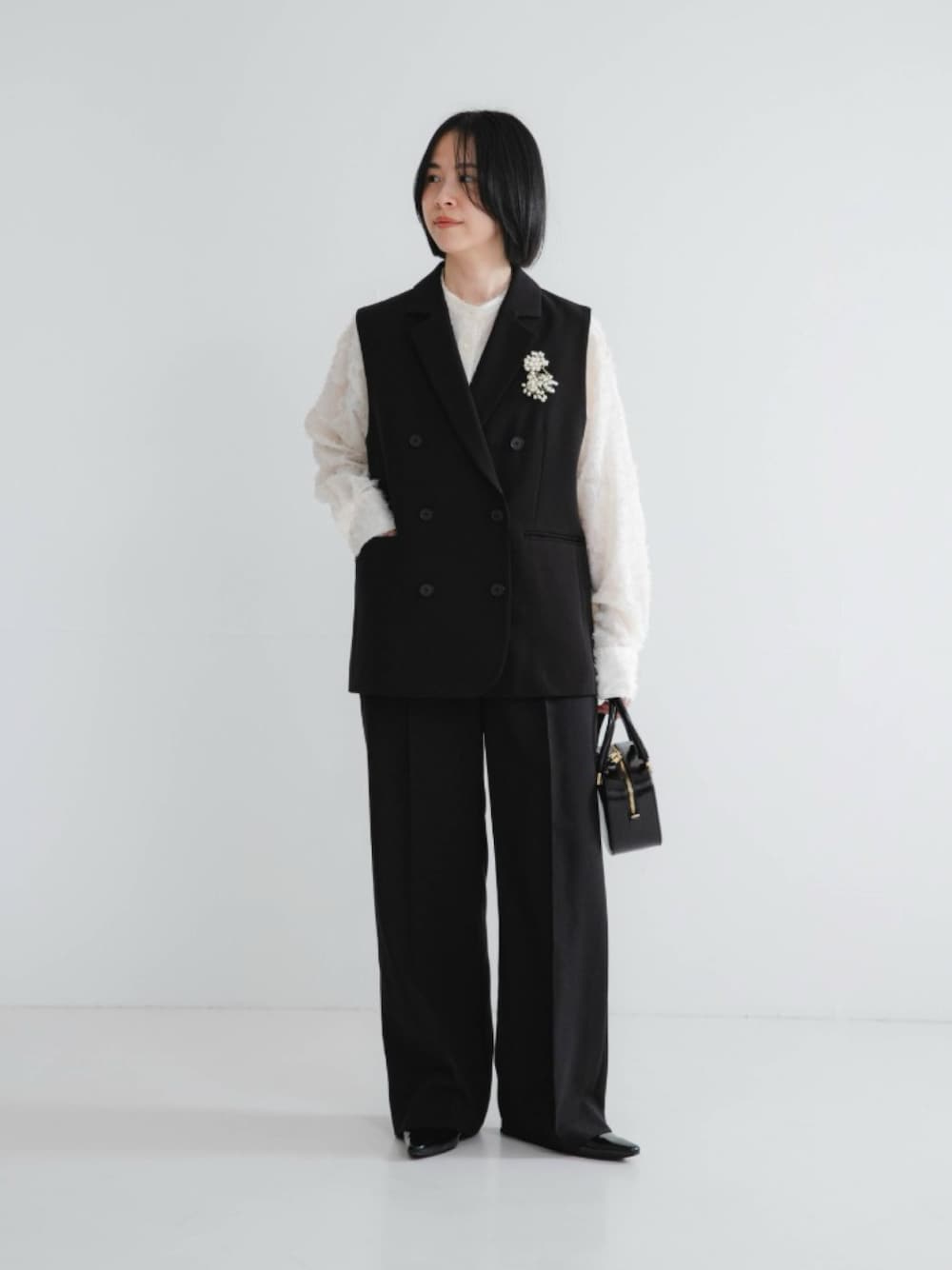 マニッシュな雰囲気が魅力。オンオフ活躍のテーラードジレ。 ストレッチの効いたポリエステル素材を使用し、裏地にも伸縮性を持たせているので、快適にストレスなく着用いただけます。 ご自宅での手洗いも可能なので、デイリーに気兼ねなく使える一枚です。 デザインは、ダブルブレストのテーラードで、マニッシュな雰囲気をプラス。 長めの着丈が落ち着いた印象を演出。シンプルなデザインなので長く愛用いただけて、シーズンレスで着回しが可能です。 ブラウスと合わせたスタイルは、オケージョンやお仕事など幅広いシーンにおすすめ。同素材のテーパードパンツとセットアップで着用すれば、より洗練された着こなしが完成します。 シーズンレスでオンスタイルにも活躍。美シルエットスラックス。 ウールのような上品な風合いを持つ、ドライタッチな素材でお作りしたパンツです。ナチュラルなストレッチ感があり、シーズンレスでお使いいただけます。 軽くてシワになりにくいのも魅力です。 ご自宅で手洗いができるため、デイリーに気兼ねなく使えます。 ワンタックのストレートシルエットで、身体のラインを拾わず程よくすっきりとした印象に。丈は足の甲にかかるくらいのすっきりとした形に仕上げました。 後ろゴム仕様で、ストレスフリーな履き心地です。 ブラウスに同素材のノーカラージャケットを合わせた、まとまりのあるセットアップでの着用がおすすめです。もちろん、シンプルなニットやカジュアルなトップスとも好相性で、幅広い着回しが可能です。 ベーシックなカラーに加え、身長や体型に合わせて選べる3サイズをご用意しています。